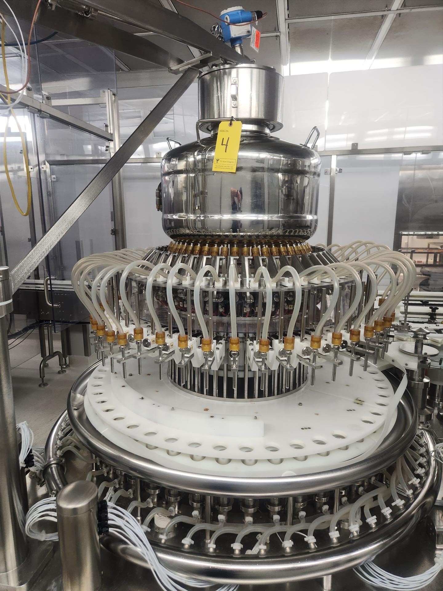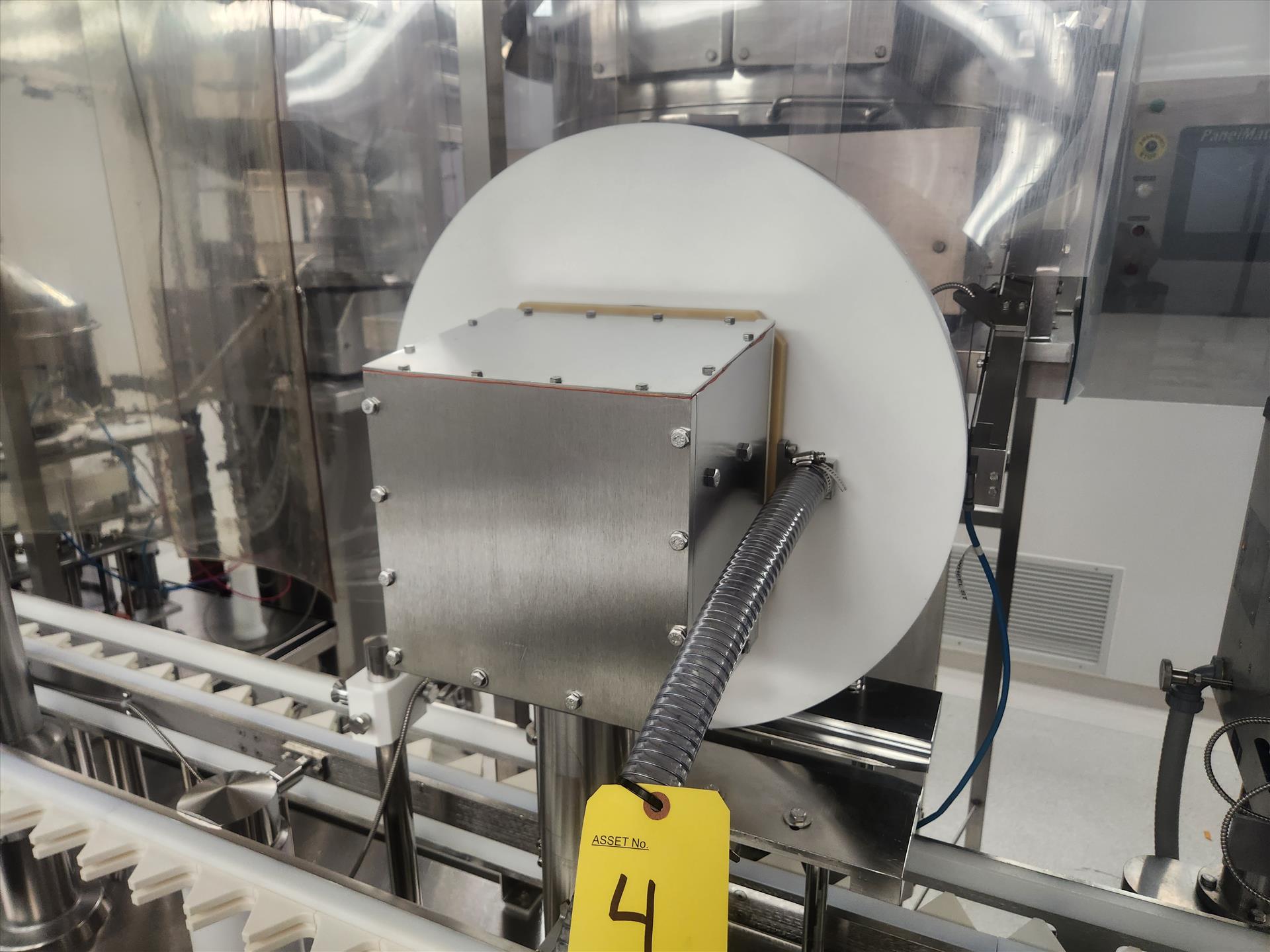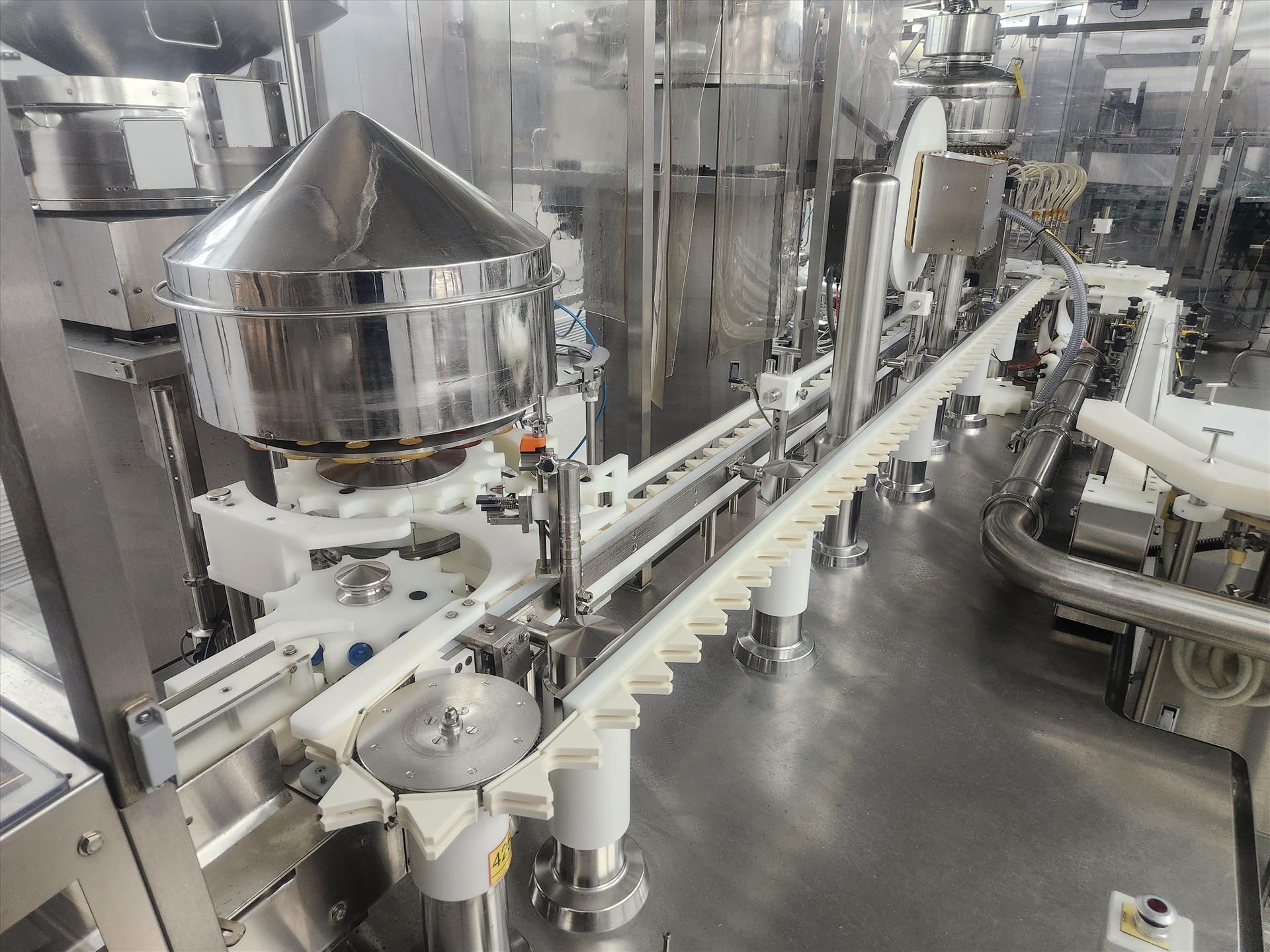 Bosch/TL Systems rotary filler, ADM 48-nozzle, mod. CV/K55JXEPT-935, ser. no. 11043, 27 USG, stainless steel w/ carousel conveyor, plug inserter, 16-head capper, exit conveyor, set-up for 360 ml bottles and EandH flow meter [wall must be removed prior to removal] (Subject to confirmation. The winner will be determined based on the sum of bids on lots 1 to 11 vs bid on bulk lot 12)