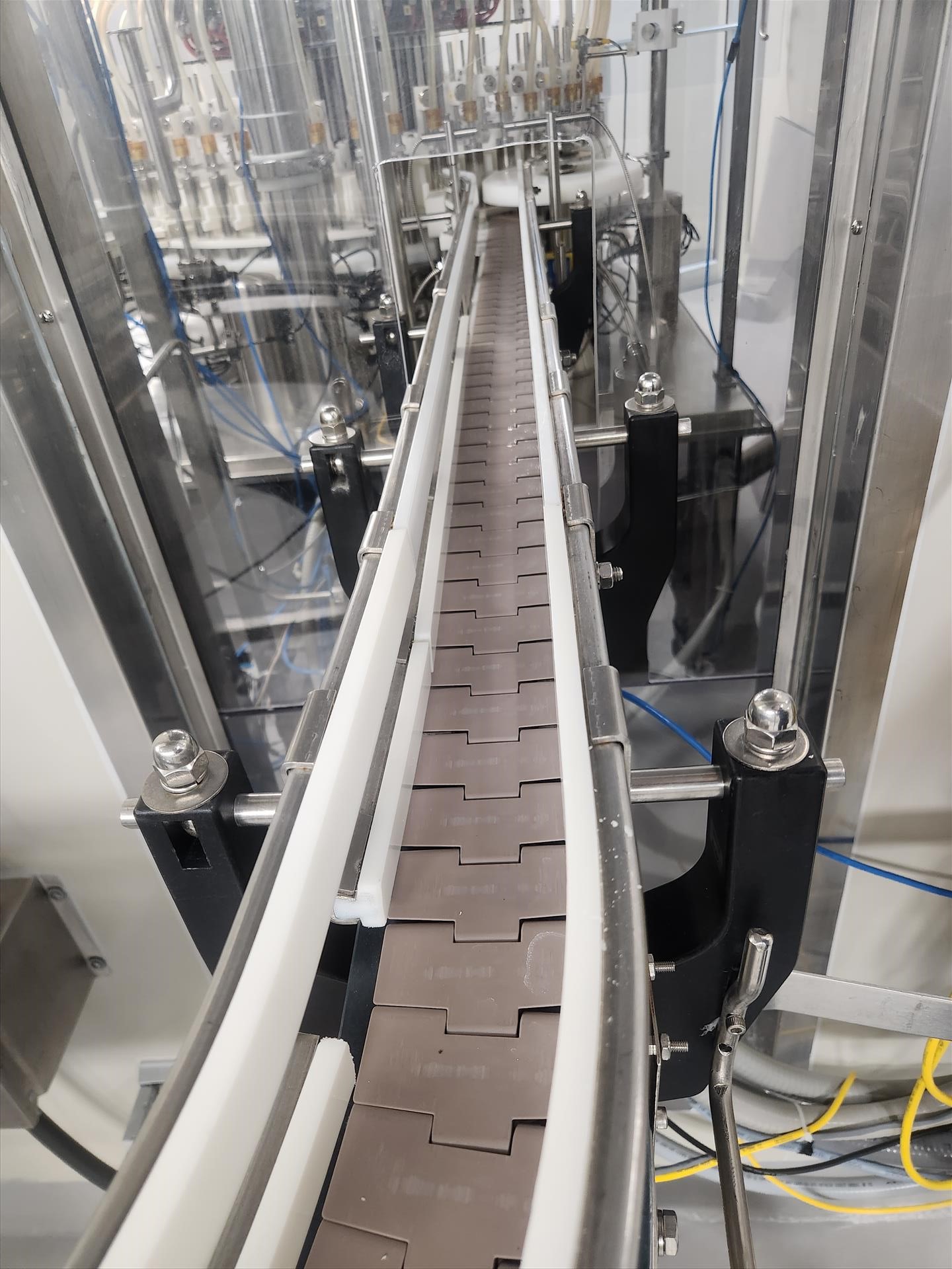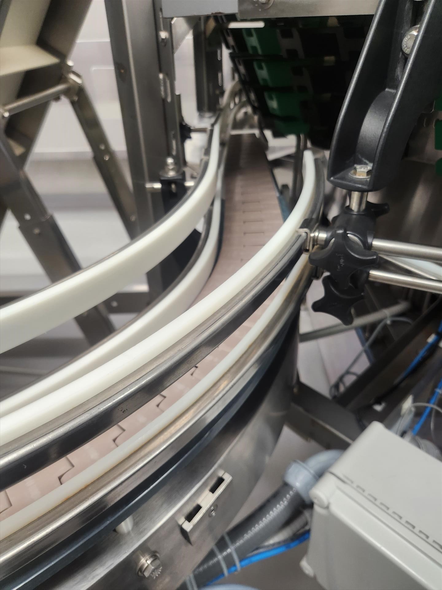 slat-top chain conveyor, stainless steel, approx. 3 in. x 20 ft., (2) 90 deg., power [wall must be removed prior to removal] (Subject to confirmation. The winner will be determined based on the sum of bids on lots 43 to 53 vs bid on bulk lot 54)