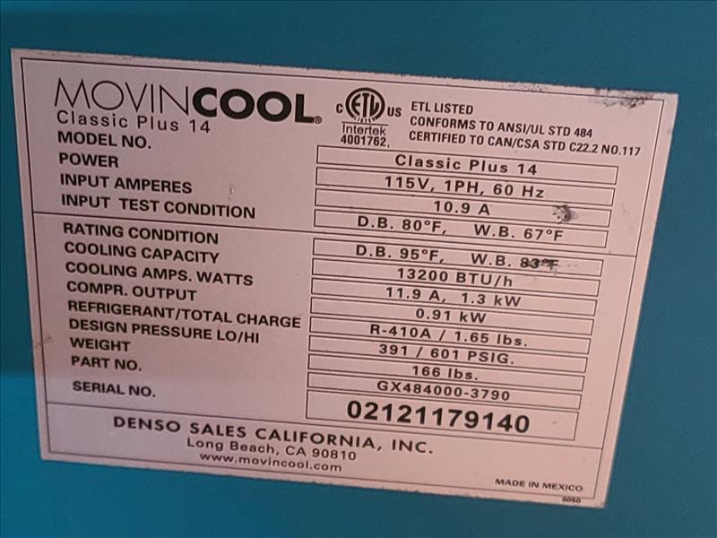 MovinCool industrial air conditioner, mod. Classic Plus 14, 13200 BTU/hr.