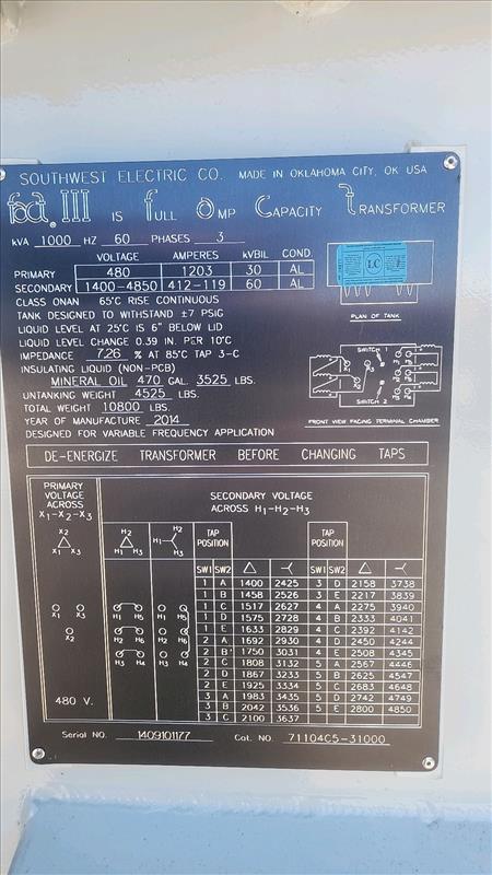 NEW Southwest Elec. full OMP capacity transformer, mod. Fab III, 1000KVA, primary 480V, 1203A, 30KVBIL, secondary 1400-4850V, 412-119A, 60KVBIL, cat. 71104C5-31000, ser. no. 140910 (2014)