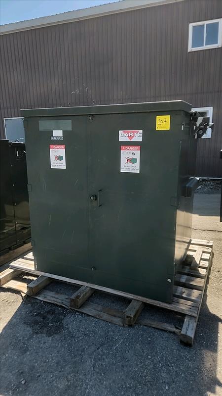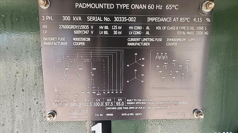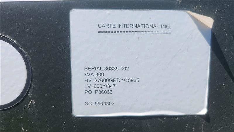Carte pad mount transformer, 300KVA, HV 27600GRDY/15935V, 125KVBIL, LV 600Y/347V, 30KVBIL, type. ONAN 60hZ 65C, ser. no. 30335-002 w/ outdoor housing