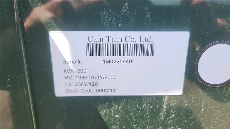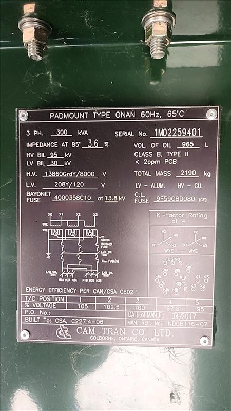 CanTran pad mount transformer, 300KVA, HV 13860GRDY/8000V, 95KVBIL, LV 208Y/120V, 30KVBIL, type. ONAN 60hZ 65C, ser. no. 1M02259401 (2017) w/ outdoor housing