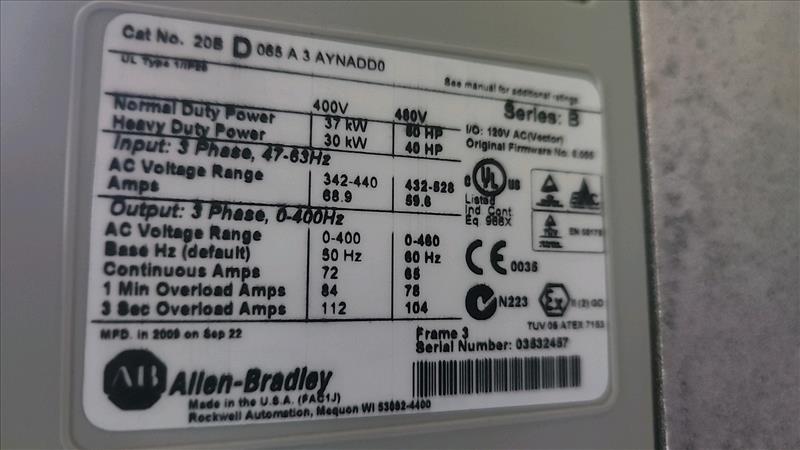 AB variable frequency drive (VFD), mod. PowerFlex 700, 50 hp, cat. 20B D 065 A 3 AYNADD0, Series B, ser. no. 03632457
