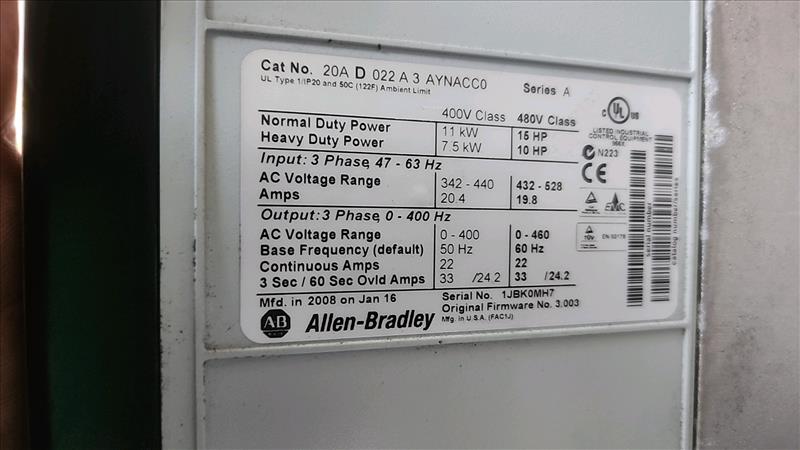 AB variable frequency drive (VFD), mod. PowerFlex 70, 15 hp, cat. 20A D 022 A 3 AYNACC0, Series A, ser. no. 1JBK0MH7