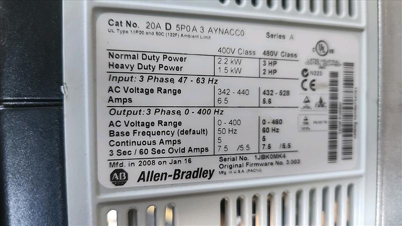 AB variable frequency drive (VFD), mod. PowerFlex 70, 3 hp, cat. 20A D 5P0 A 3 AYNACC0, Series A, ser. no. 1JBK0MK4