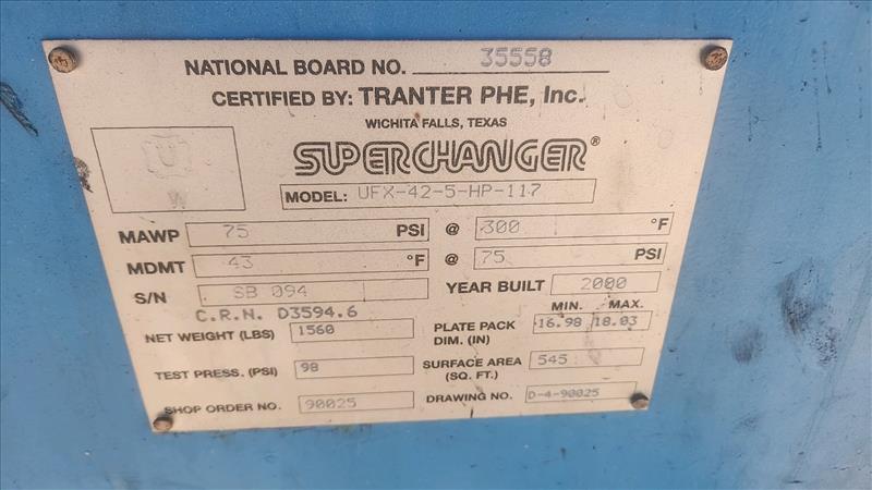 SuperChanger heat exchanger, mod. VFX-42-5-HP-117, ser. no. SB094, 545 sq. ft. SA