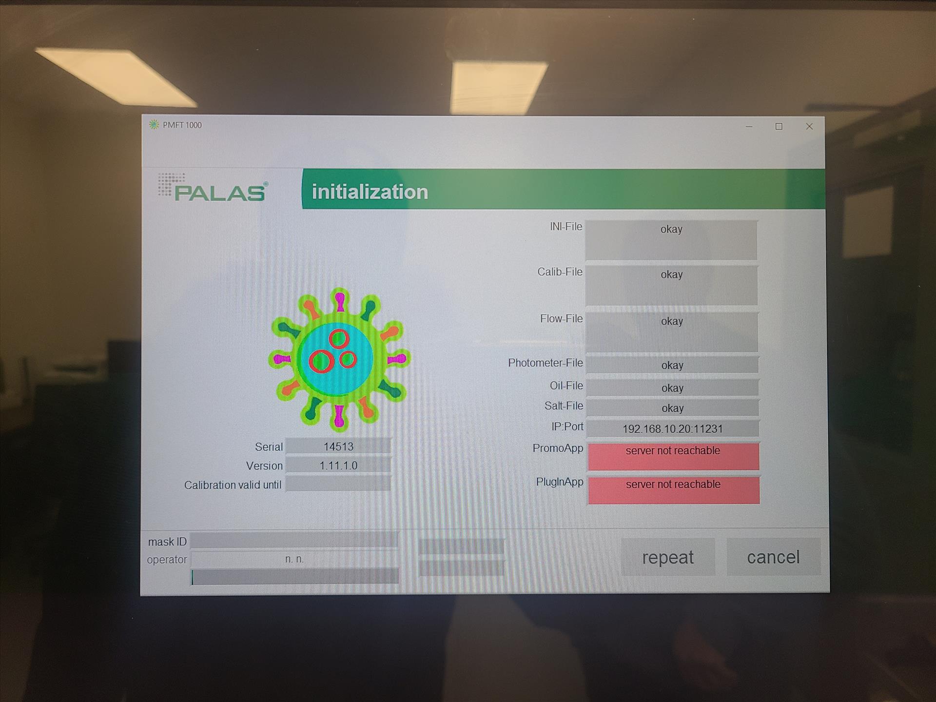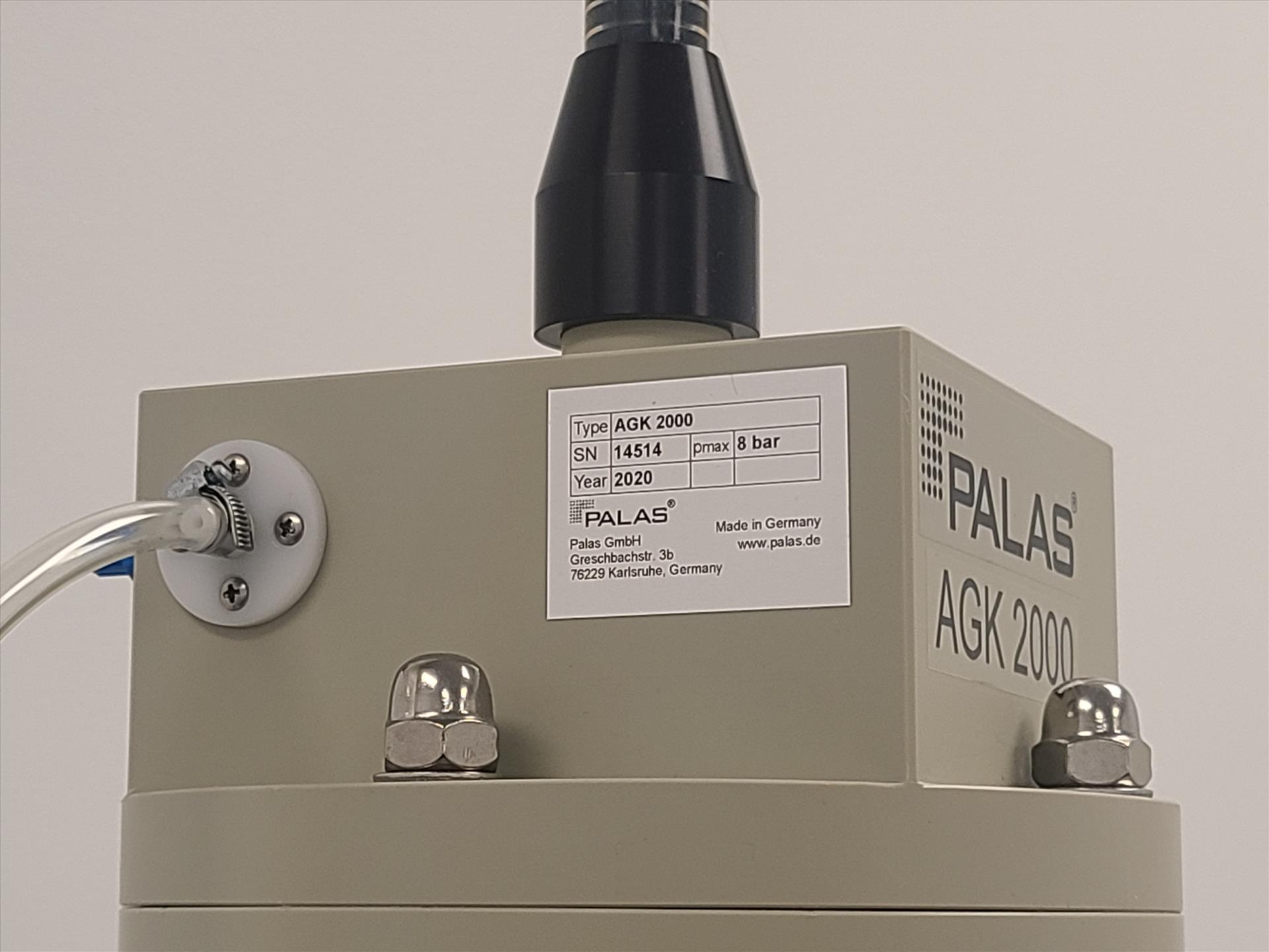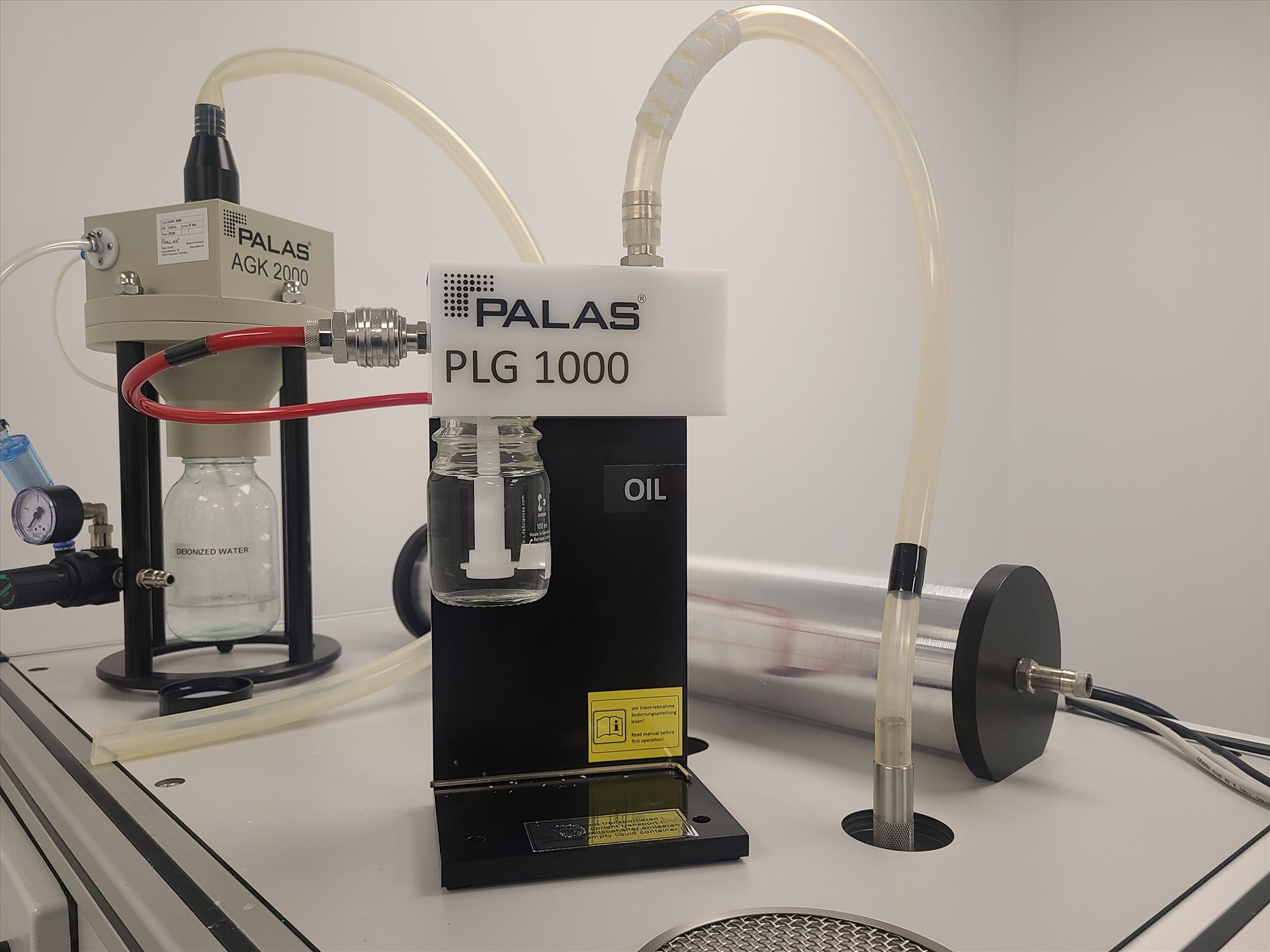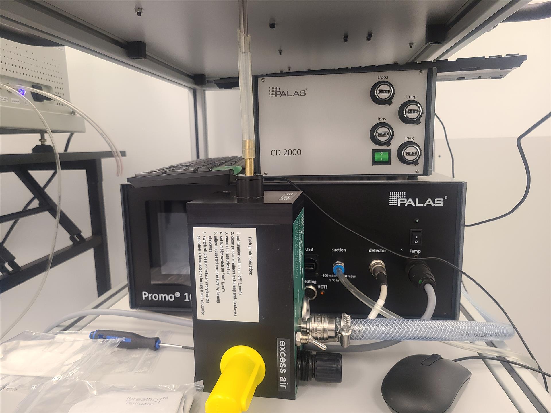 Palas Face Mask Testing Machine, model PMFT 1000, S/N 14513 , w/PMFT 1000 filter holder, promo 1000 control unit, welas aerosol sensor 1200, temperature and humidity sensor, Palas AGK 2000, Palas PLG 1000, desktop computer, monitor and keyboard (2021)