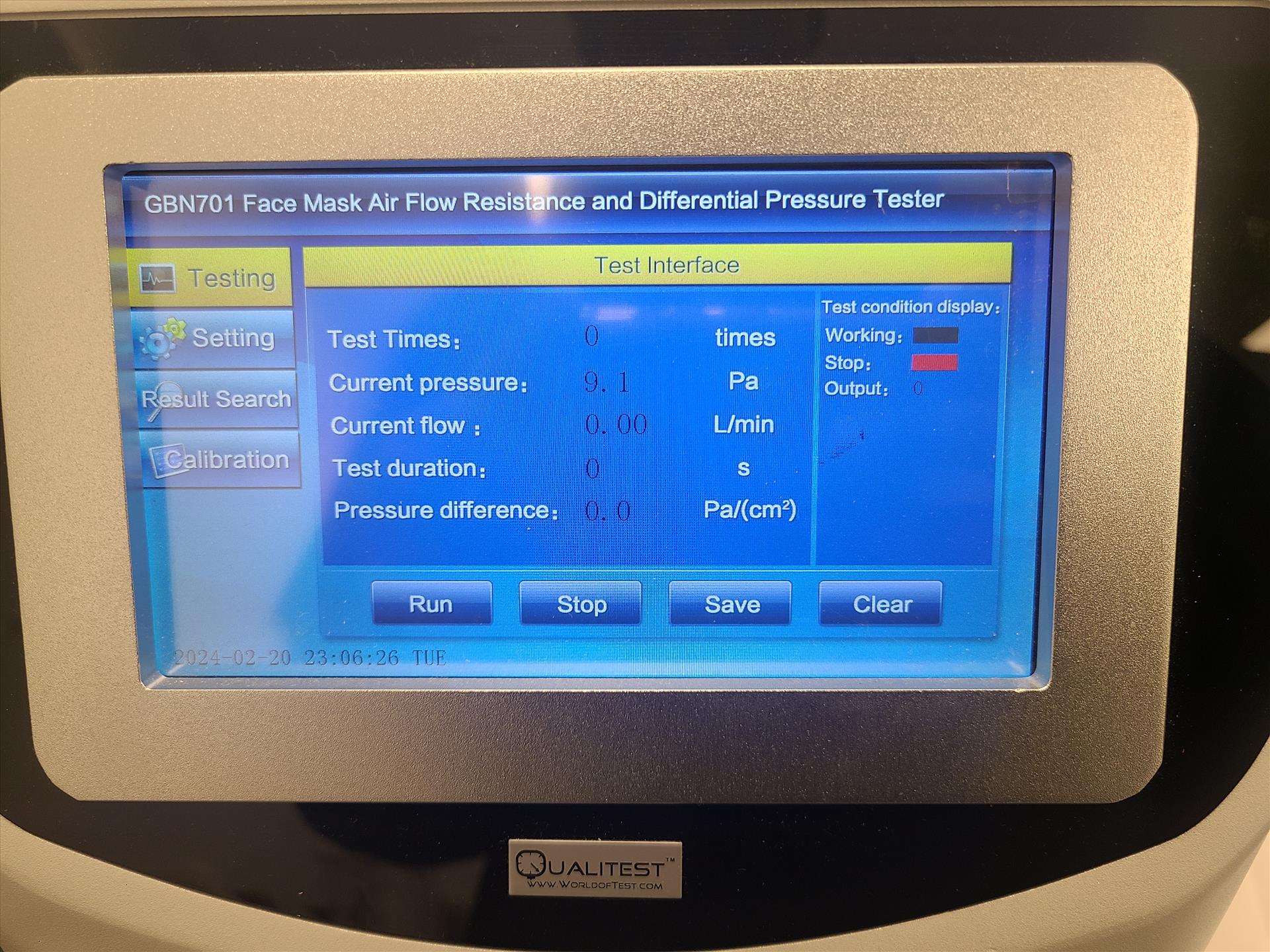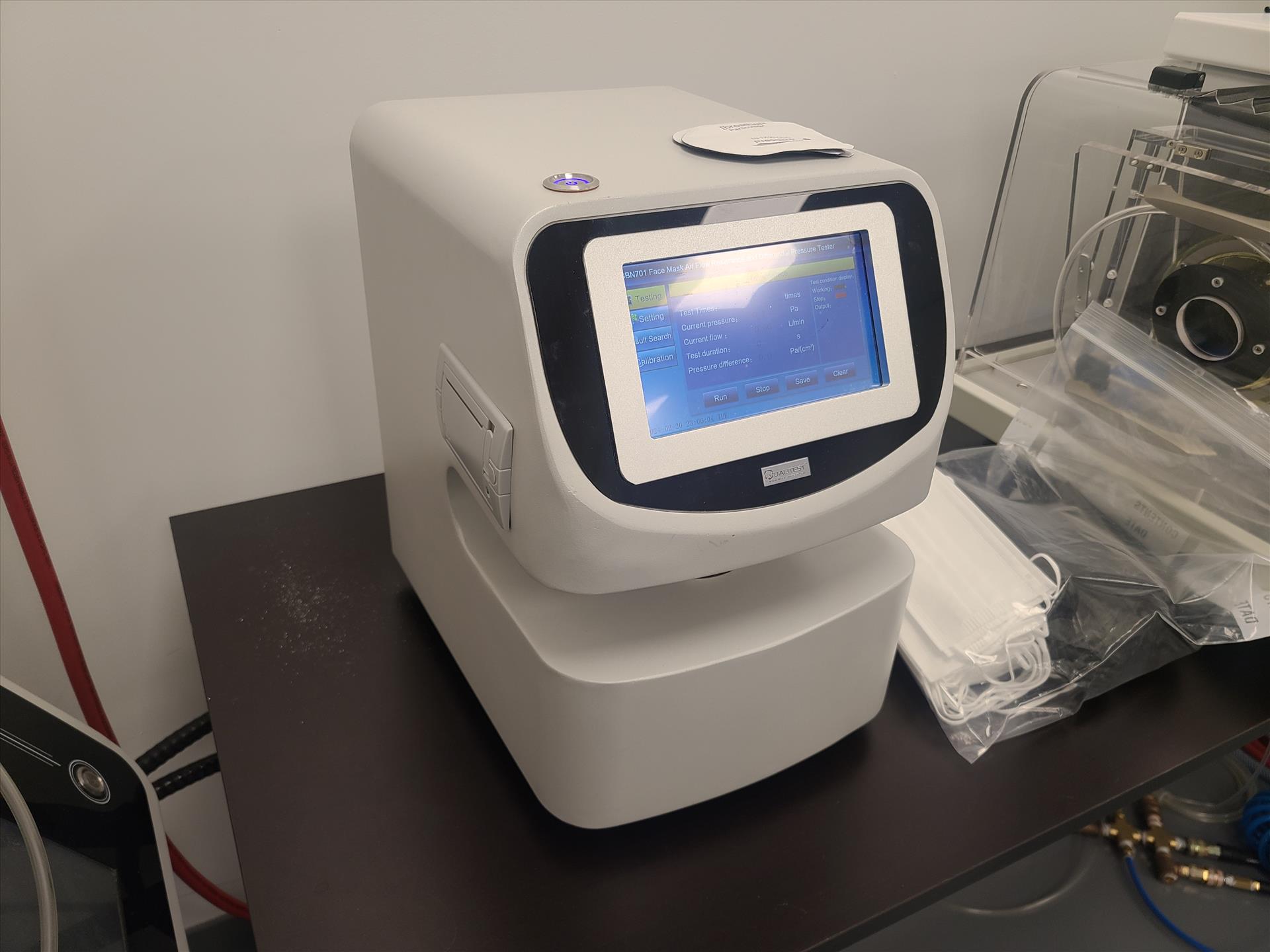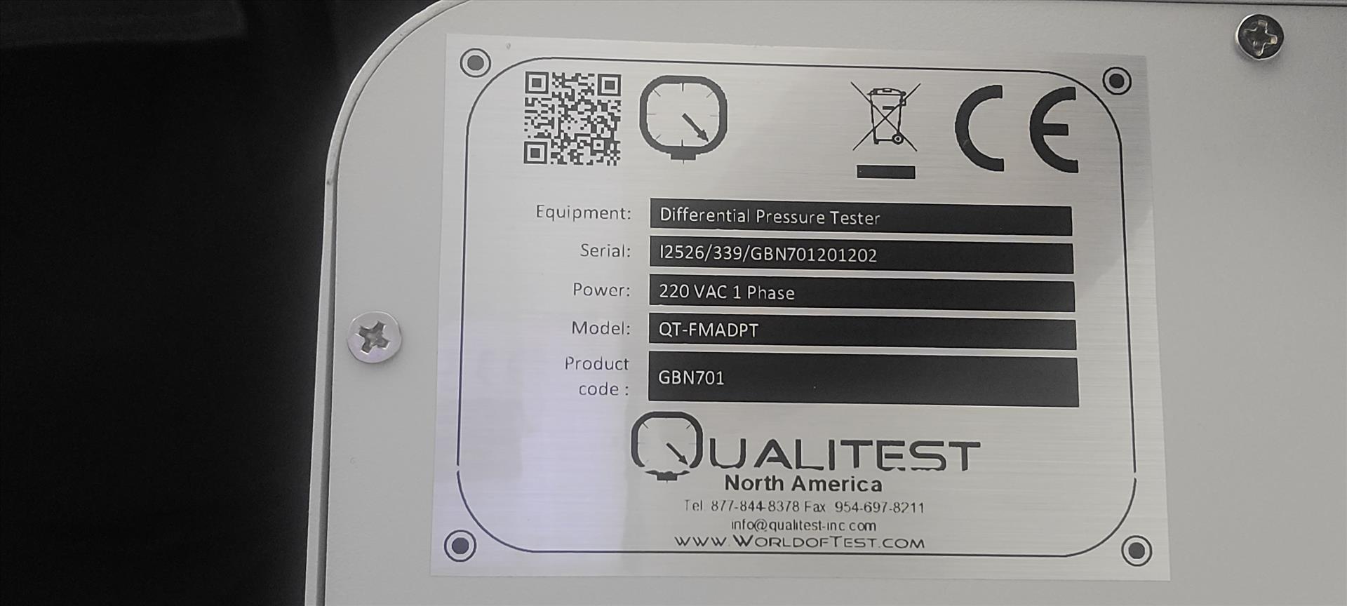 Qualitest Face Mask Differential Pressure Tester, model QT-FMADPT, S/N 12526/339/GBN701201202, 220 VAC, 1 Phase, w/built in HD touch screen, built in micro printer, high-precision differential pressure sensor, high-precision gas flow control and digital display