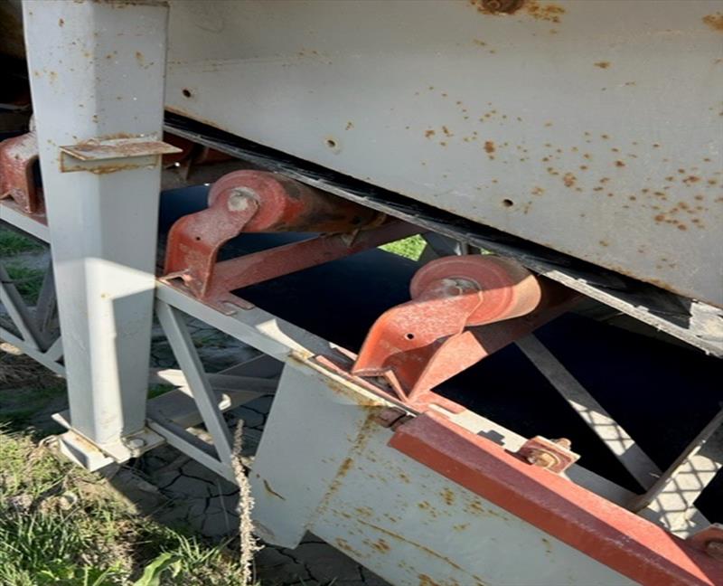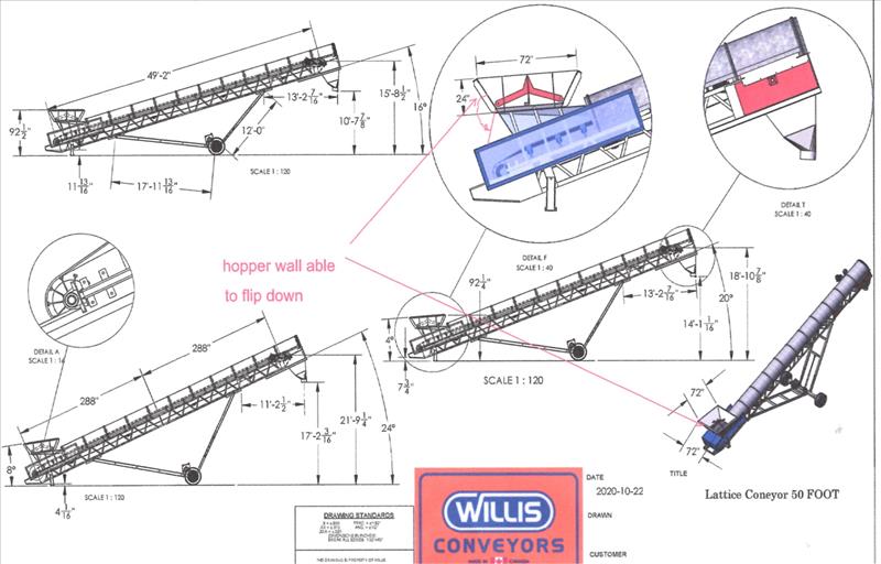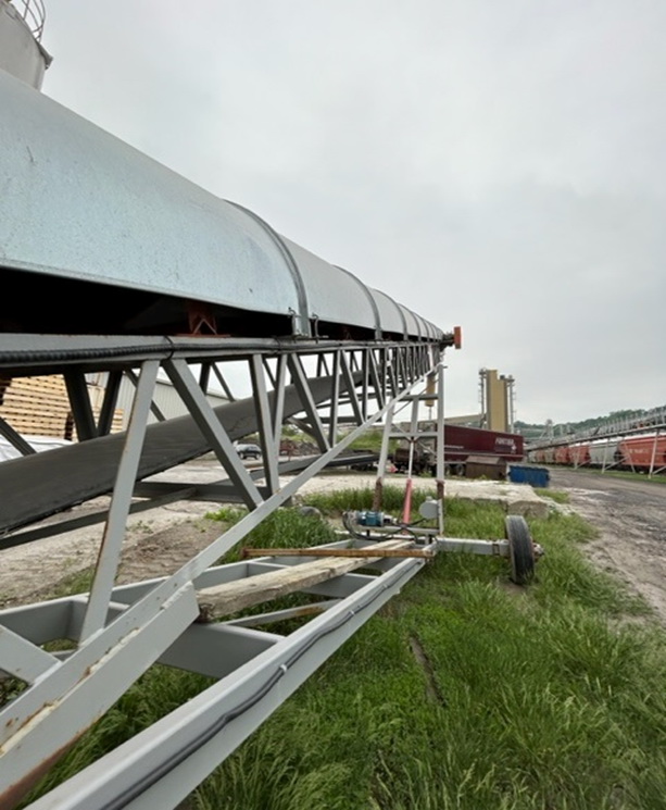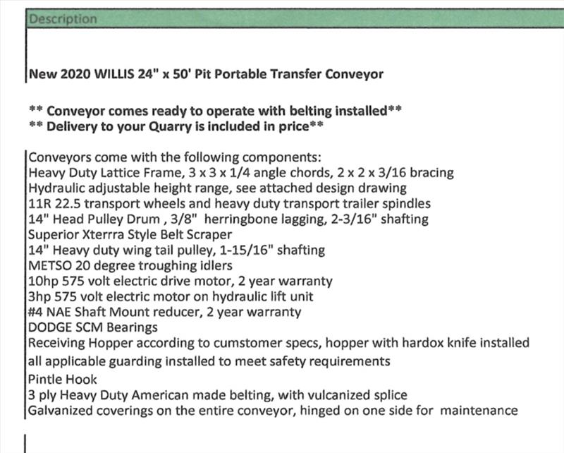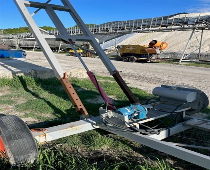 Willis Pit Portable Transfer Conveyor, Stacker, approx. 24 in. width belt x 50 ft. long, w/ WEG 10 hp, 600 volt motor, dodge bearing, vulcanized belt joint, hydraulic legs, regular return idler and fully enclosed galvanized covering (2020) (Mandatory Rigging Fee: $350)