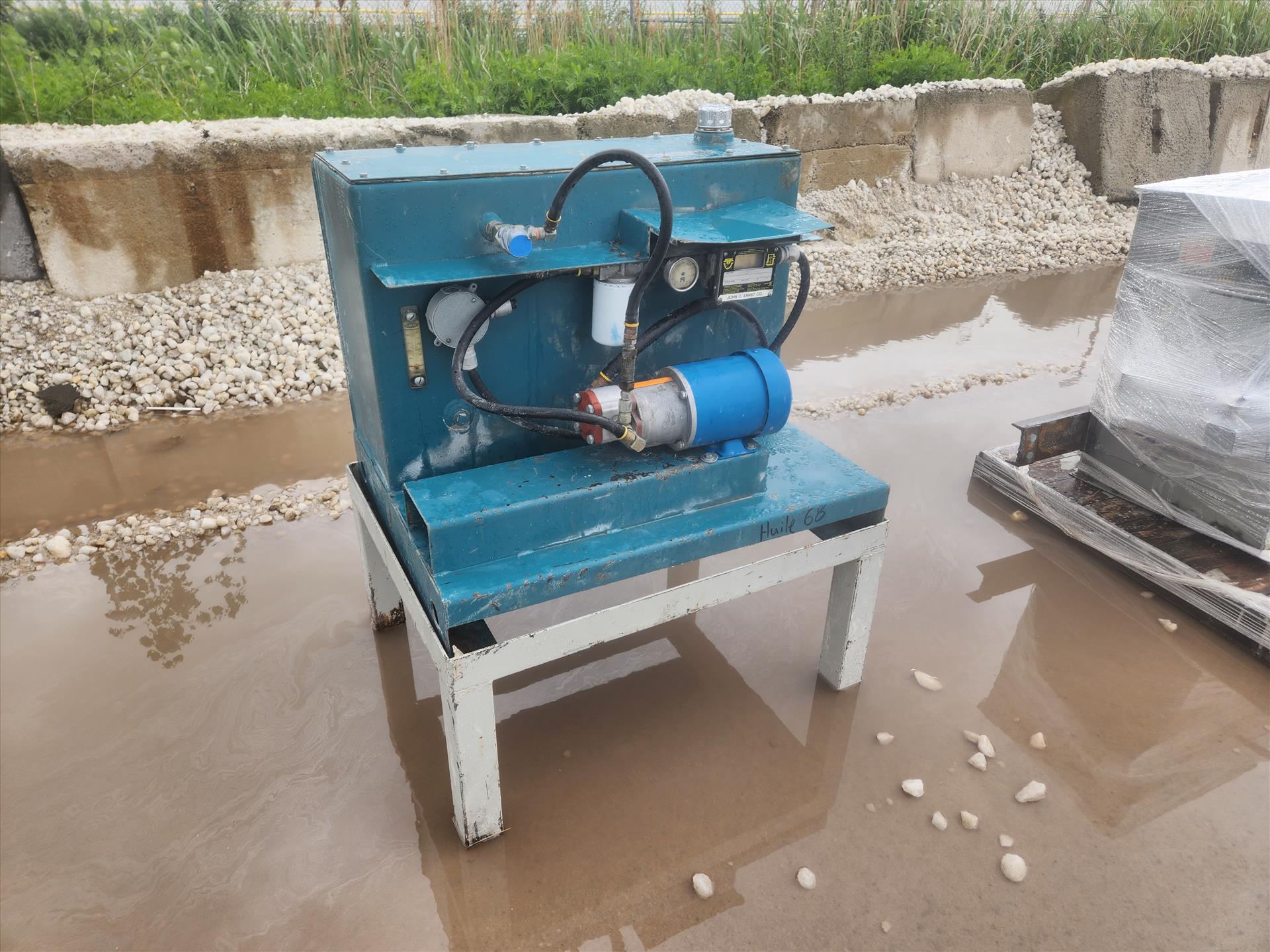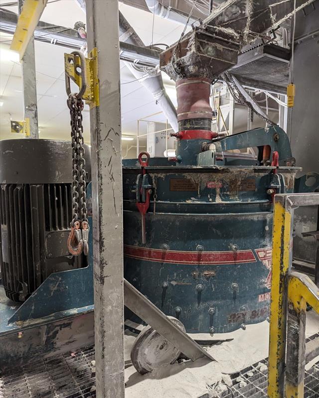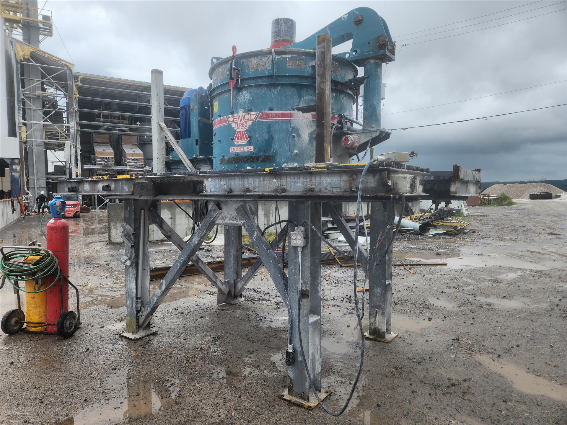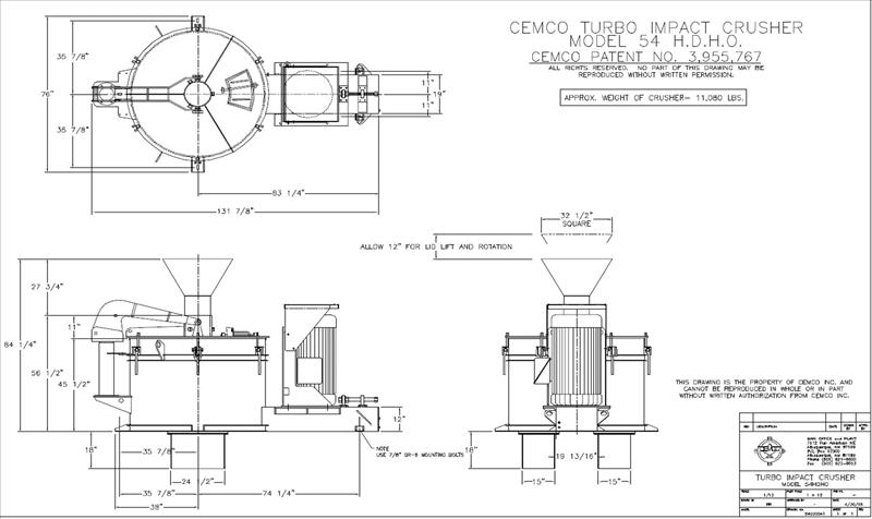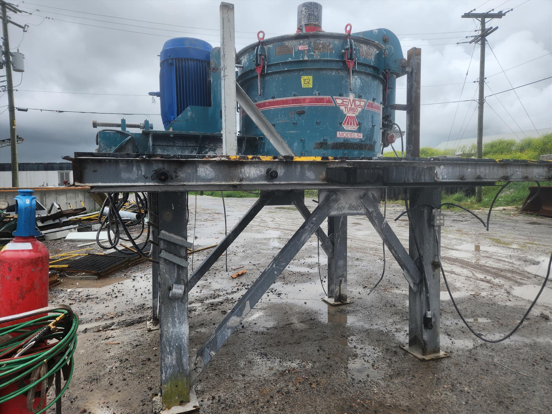 Cemco VSI Crusher, model Superchipper 54, w/ 150hp electrical drive and remote control motor, rock shelf kit, anvil kit, 27 in. rotor with 4 port, 75hp lube oil system/reservoir and filter protection, vibration switch, 115 volts ac, 125 TPH capacity, 5 in. max feed, oil cooler, 3 phase, 600 volts, 1/4hp forced air 6-25 GP, spare parts rotor liner, 150hp WEG spare motor, housing and table