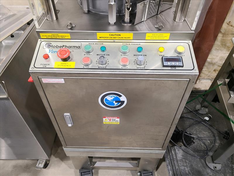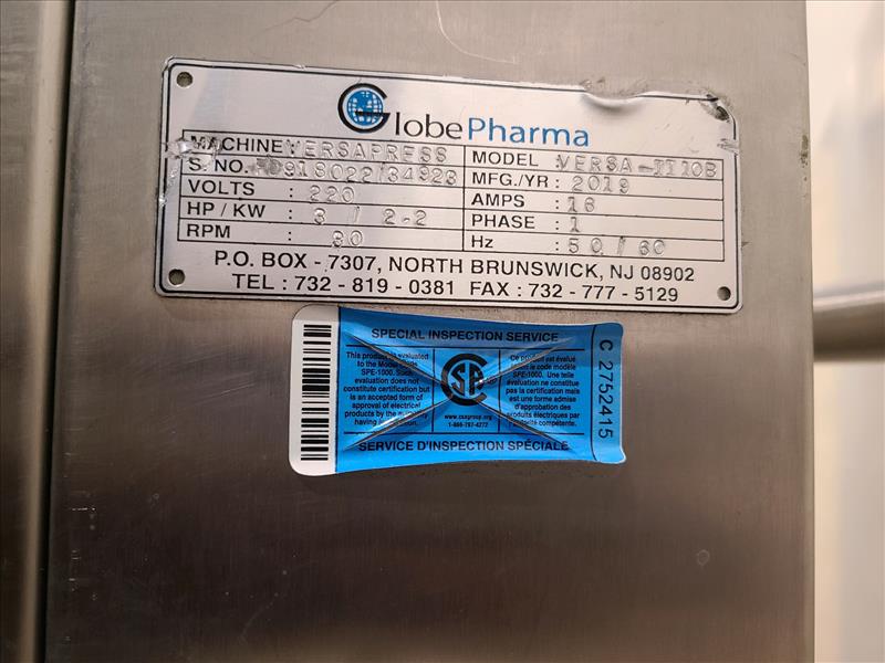 Globe Pharma Rotary Tablet Press, model VERSA-II 10B, S/N F0918022/34923, 3 hp, 30 rpm, 220 volts, 2.2 kw, 1 phase, 50/60 Hz (2019)
