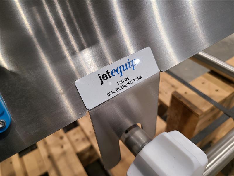 Jetequip Blending Tank, approx. 120L, w/bottom mounted mixer, stainless steel, casters (New, never installed)