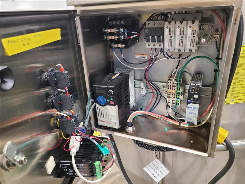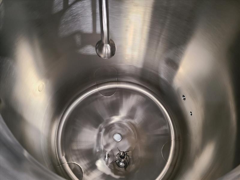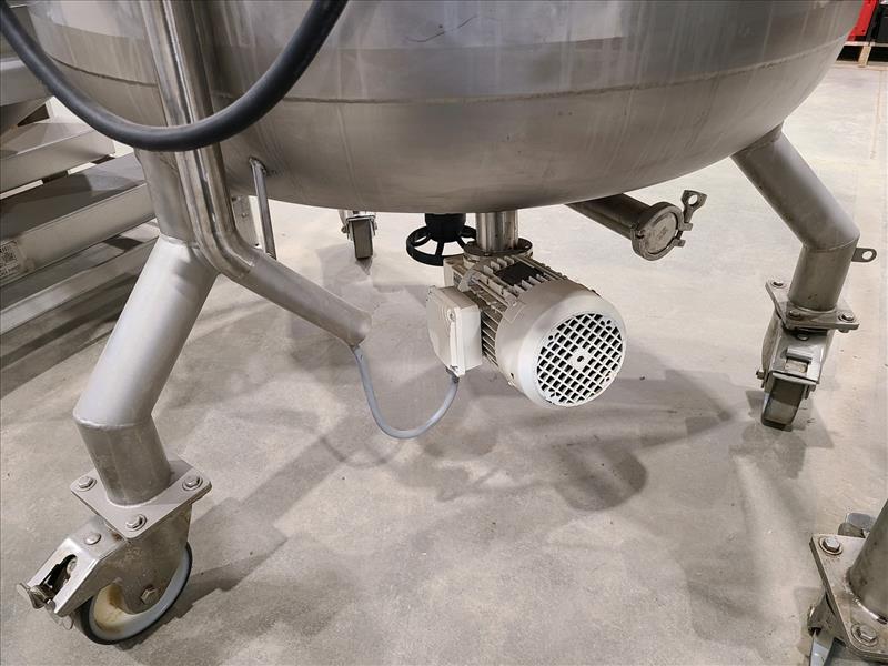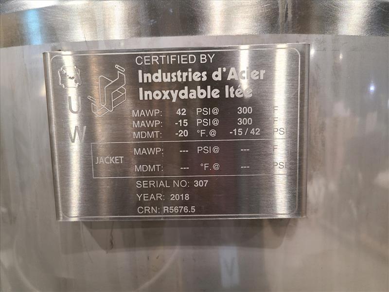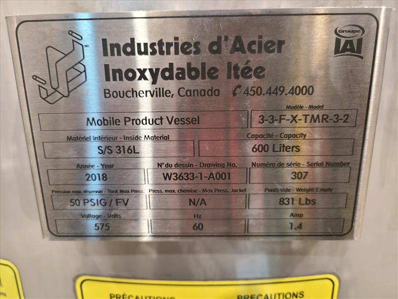 Industries D acier Inoxydable Itee Blending Tank, stainless steel, approx. 600L capacity, model 3-3-F-X-TMR-3-2, S/N 307, w/ CIP spray ball, bottom mounted mixer, 1.4A, 575 Volts, 60Hz, casters (2018)