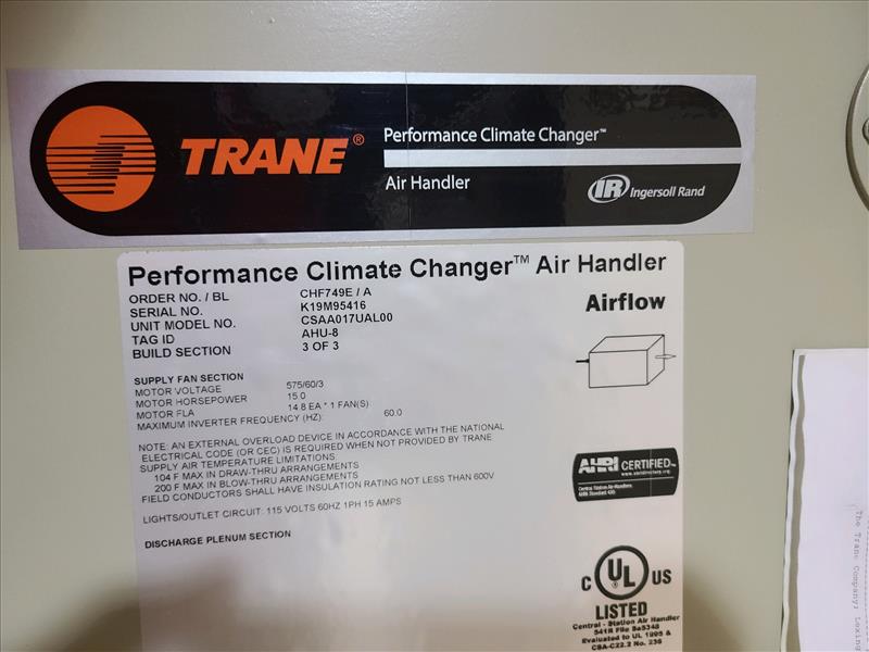 Trane Performance Climate Changer Air Handler, model CSAA017UAL00, S/N K19M95416, (3) build sections, tag id. AHU-8 (New, never installed)