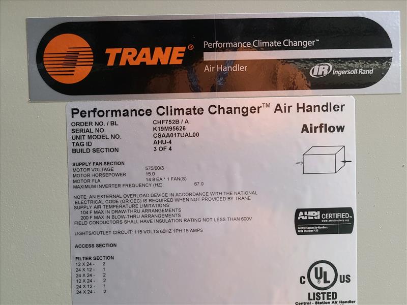 Trane Performance Climate Changer Air Handler, model CSAA017UAL00, S/N K19M95626, (4) build sections, tag id. AHU-4 (New, never installed)