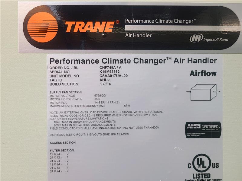 Trane Performance Climate Changer Air Handler, model CSAA017UAL00, S/N K19M95362, (4) build sections, tag id. AHU-1
