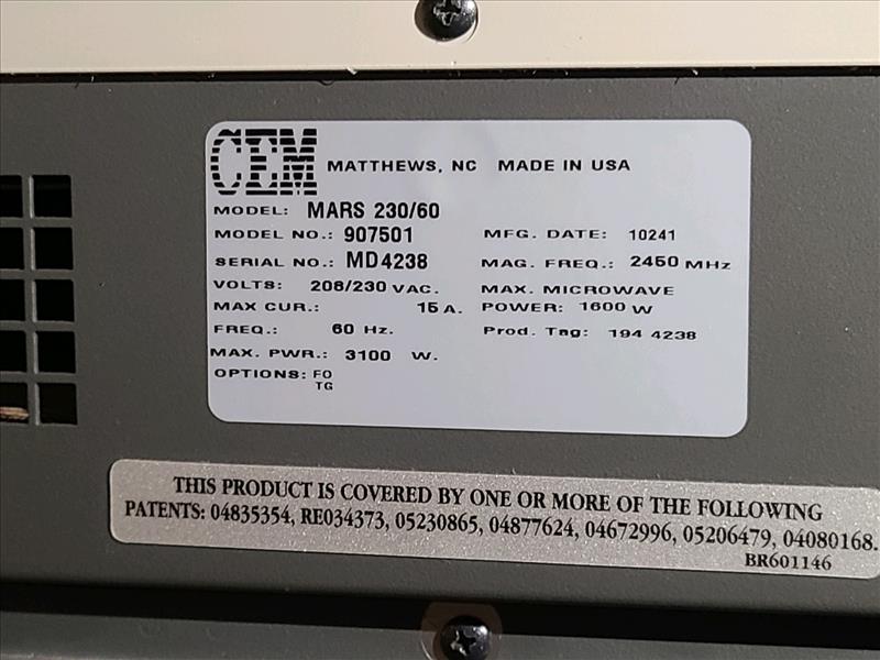 CEM Microwave Digestion System, model MARS 230/60, S/N MD4238, 3100W, 15A, 208-230 Volts, 60Hz
