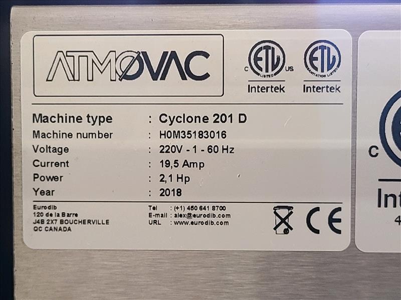 Atmovac Premium Chamber Vacuum Machine, model Cyclone 201D, M/N H0M35183016, 19.5A, 220 Volts, 60Hz (2018)