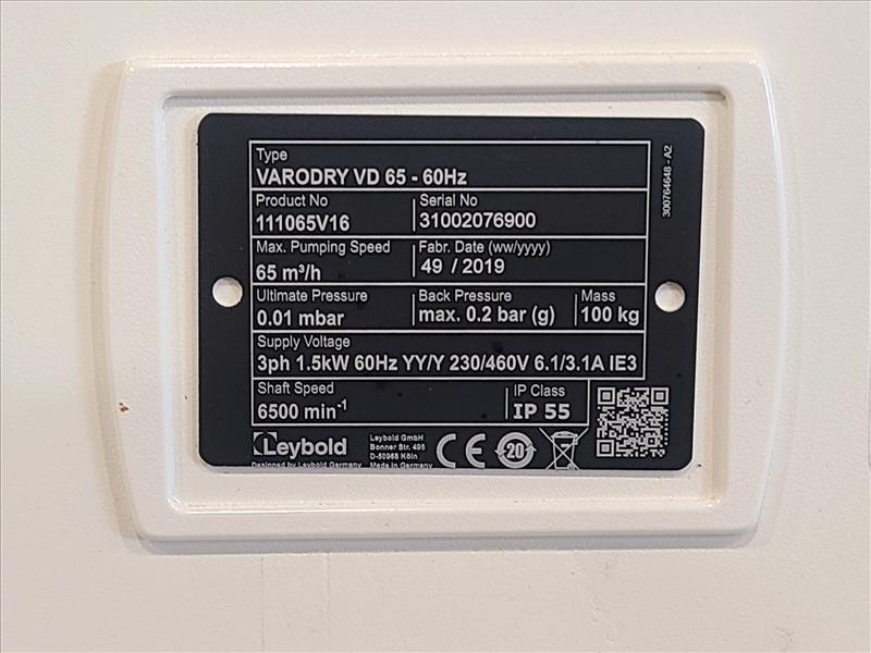 Leybold Dry Compressing Vacuum Pump, model VARODRY VD 65, S/N 31002076900, 230/460 volts, 3 phase, 60 Hz (2019)