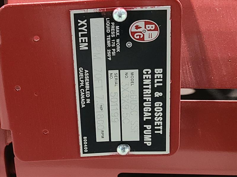 Bell & Gossett Centrifugal Pump, e-80SC Series, model 3X3X9.5C, S/N 501199, 7.5 hp, 1800 rpm, 575 volts, 3 phase, 60 Hz (New, never installed)