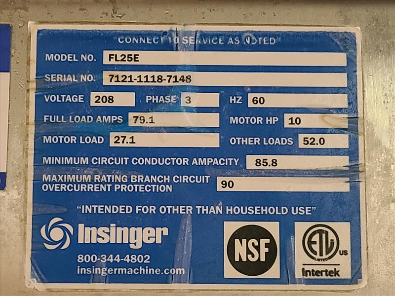 Insinger Dishwasher, model FL25E, S/N 7121-1118-7148, 208 Volts, 3 Phase, 60Hz