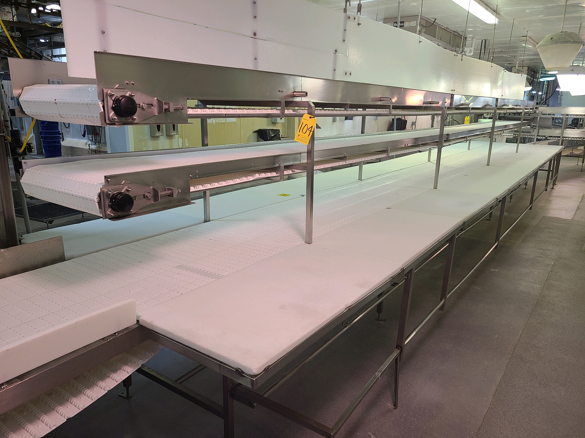 Cutting Table, w/ belt conveyors, and cutting boards, 32 positions, approx. 43 ft. x 32 in., overall width 80 in., bottom belt conveyor, approx. 36 ft. 10 in. x 23 in., stainless steel frame, top belt conveyor, approx. 36 ft. 10 in. x 23 in., stainless steel frame [Loc. Boning Department]