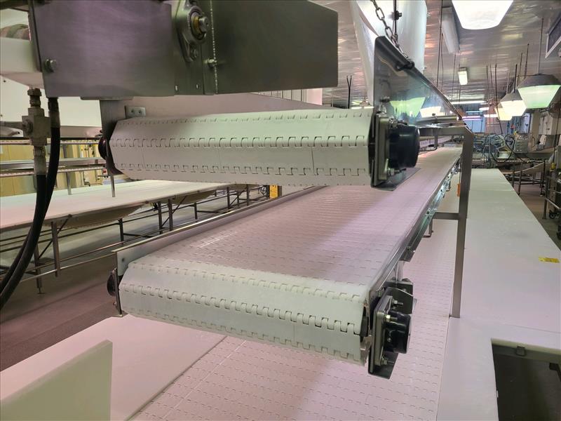 Cutting Table, w/ belt conveyors, and cutting boards, 32 positions, approx. 43 ft. x 32 in., overall width 80 in., bottom belt conveyor, approx. 36 ft. 10 in. x 23 in., stainless steel frame, top belt conveyor, approx. 36 ft. 10 in. x 23 in., stainless steel frame [Loc. Boning Department]\n