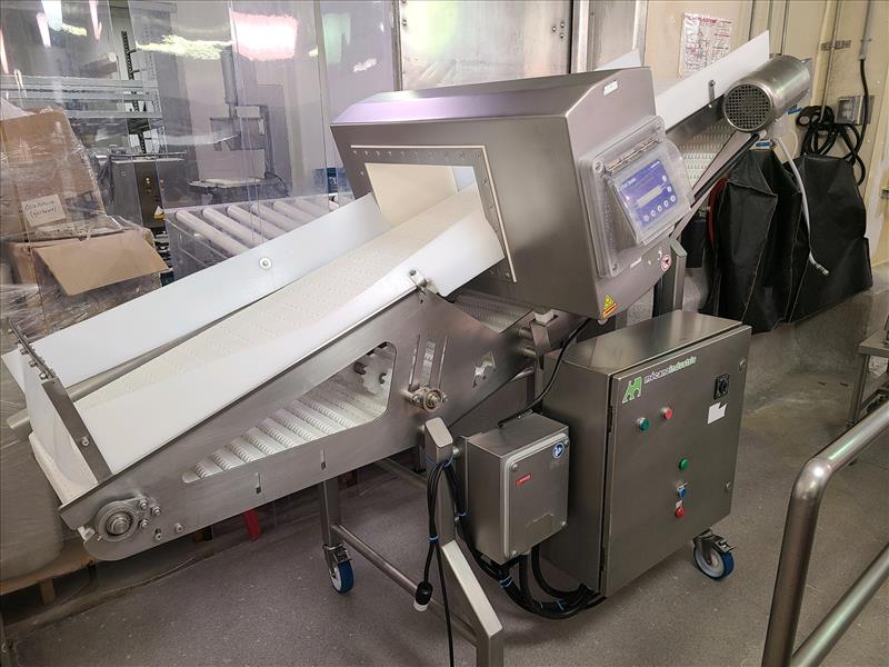 Motorized Incline Belt Conveyor, approx. 94 in x 16 in., 0.25 hp motor, w/ Mettler Toledo Metal Detector, opening approx. 10 in. x 17.5 in., top of belt conveyor to top of metal detector approx. 8 in. high, casters [Loc. Packaging Department]