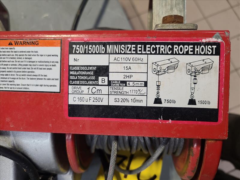 Electric Rope Hoist, 750/1500lbs Capacity, 2HP, 110 volts, 15A, 60Hz [Loc. Machine Shop]
