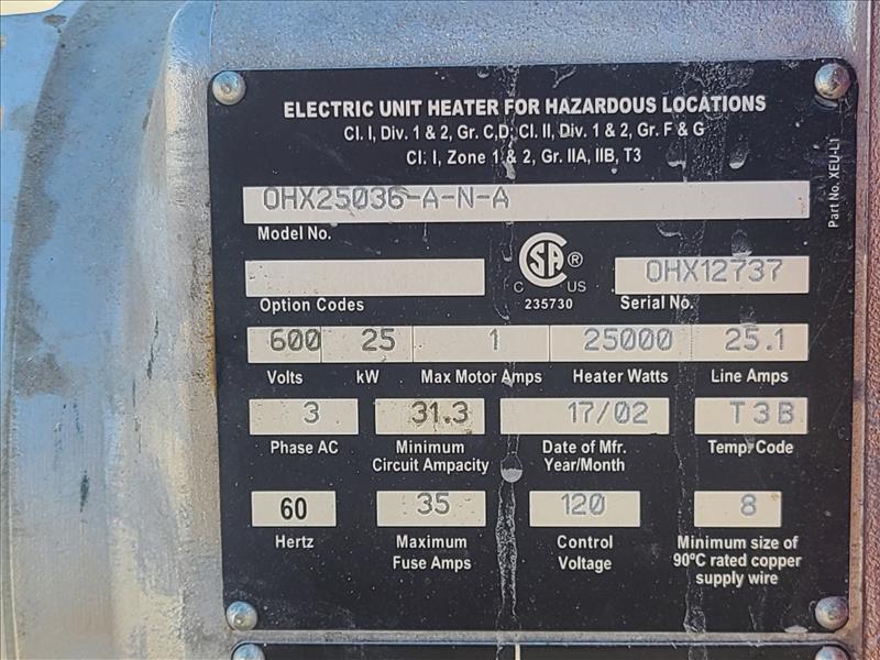 Ouellet Electric Heater, model OHX25036-A-N-A, S/N OHX12737, 600 volts, 3 phase, 60Hz [Loc. Garage]