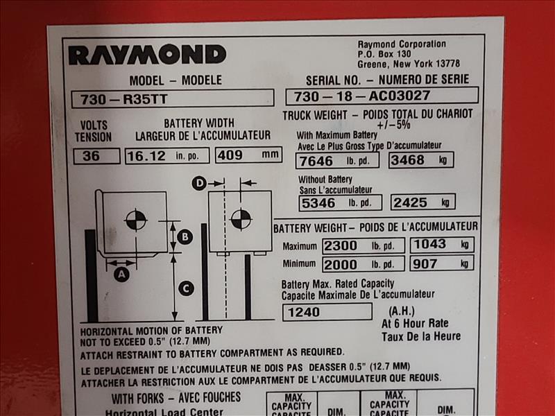 Raymond Reach Truck, model 730-R35TT, S/N 730-18-AC03027 [Loc. Shipping/Receiving]