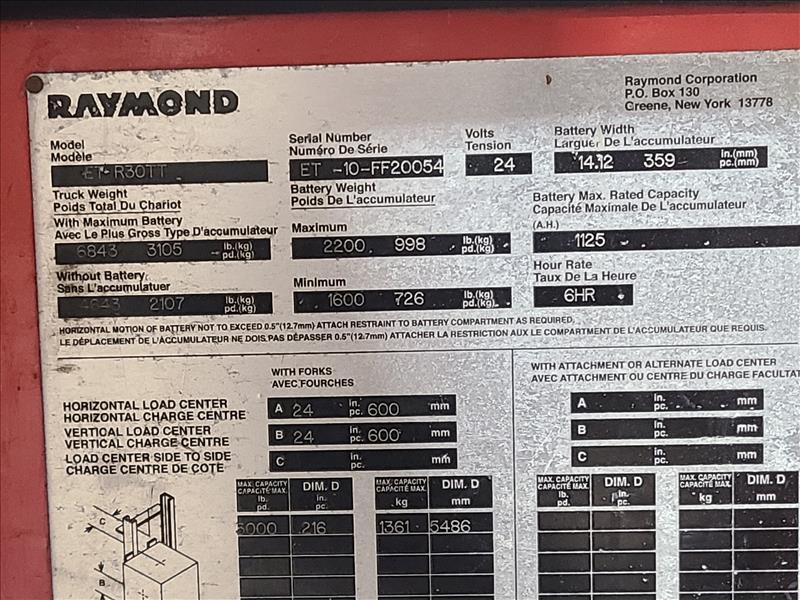 Raymond Reach Truck, model ET-R30TT, S/N ET-10-FF20054, 6000 lbs. capacity [Loc. Shipping/Receiving]