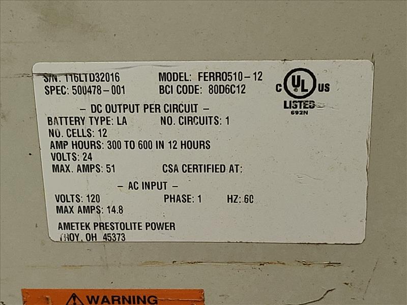 LTD Products Battery Charger, model FERRO510-12, S/N 116LTD32016, 120 volts, 1 phase, 60Hz [Loc. Shipping/Receiving]