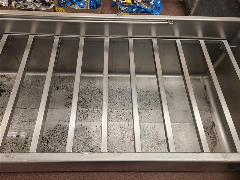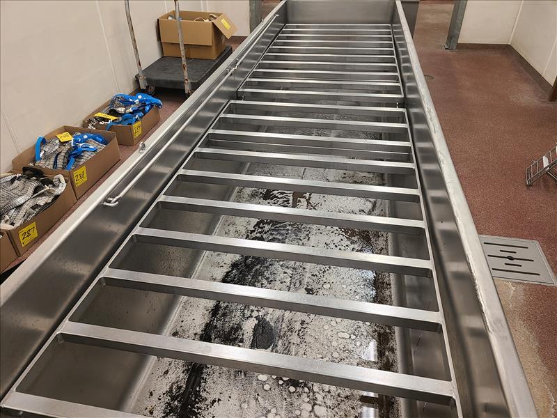 Stainless Steel Tank, approx. 128 in. x 30 in. x 23 in. Depth, w/stainless steel racks, approx. 57.5 in x 30 in. [Loc. Sanitation Room]