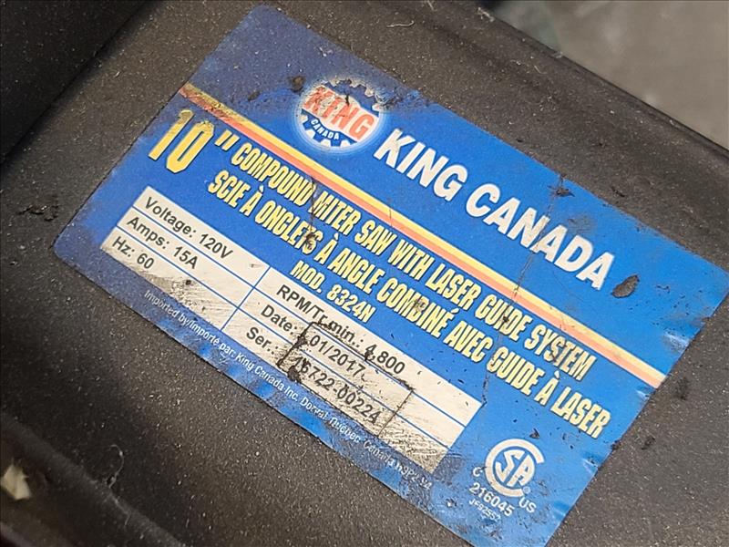 King Canada Compund Miter Saw, model 8324N, S/N 16722-00224, w/laser guide system, approx. 10 in saw, 120 volts, 15A, 60Hz (2017) [Loc. Machine Shop]