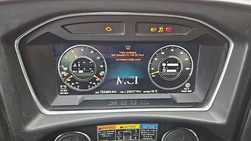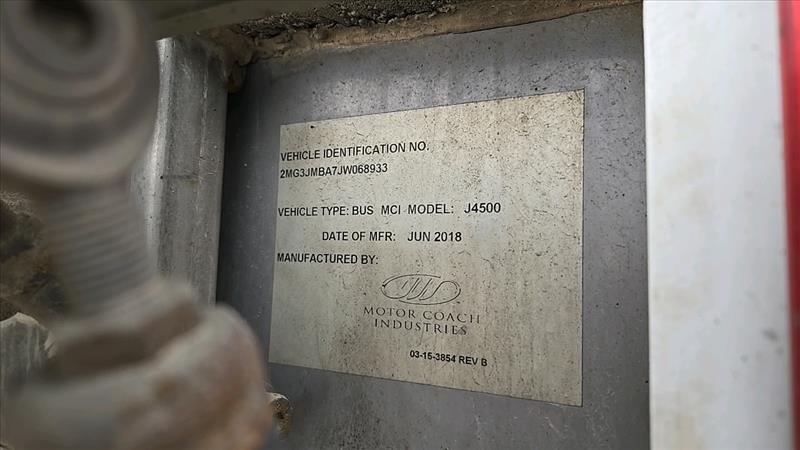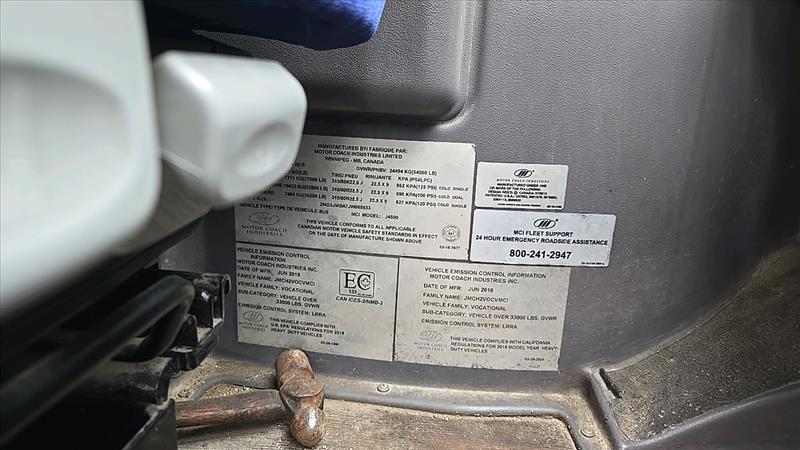 (2018) MCI Passenger Coach Bus, model J4500, 6 cylinder, 56 seats, Seat belts, USB plugs, Over parcel bins, Washroom, 4 monitors and DVD player, Kneeling bus, 110 volt plug-in, Cummins Allison Engine, Operational, Bus number 65, VIN 2MG3JMBA7JW068933, 732484km, as-is-where-is, Safety valid until Nov. 2024 (subject to confirmation)