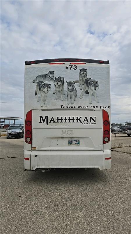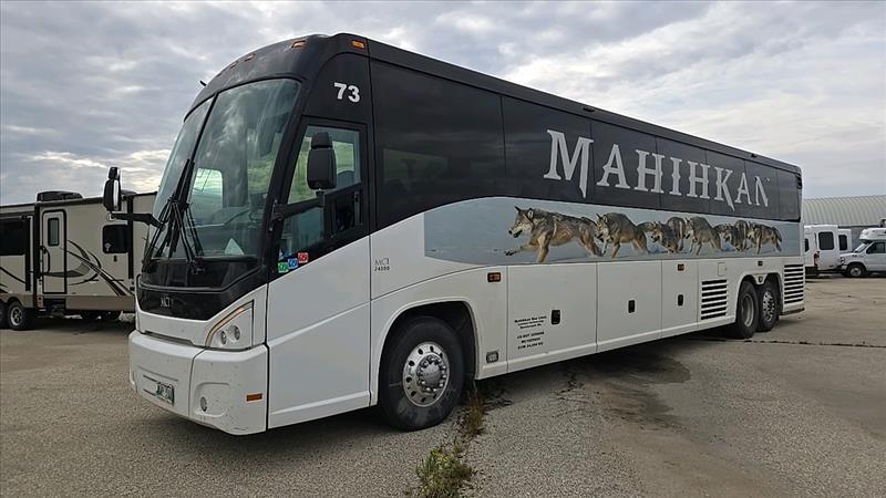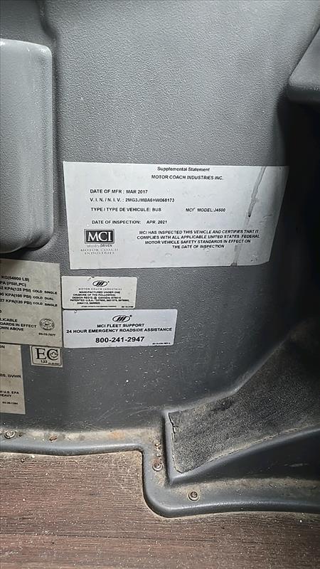 (2017) MCI Passenger Coach Bus, model J4500, 6 cylinder, 56 seats, Seat belts, USB plugs, Over parcel bins, Washroom, 5 monitors and DVD player, Kneeling bus, 110 volt plug-in, Cummins Allison engine, Operational, Bus number 73, VIN 2MG3JMBA6HW068173, 614020 KM, as-is-where-is, Fully operational, Safety valid until Feb. 2025