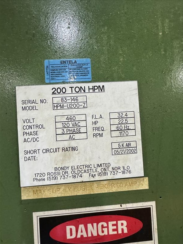 HPM model C-20-Z 200 ton hot chamber die cast machine s/n 83-146 w/ FN-3 furnace spray system and 2002 plc controls [Loc. Plant]
