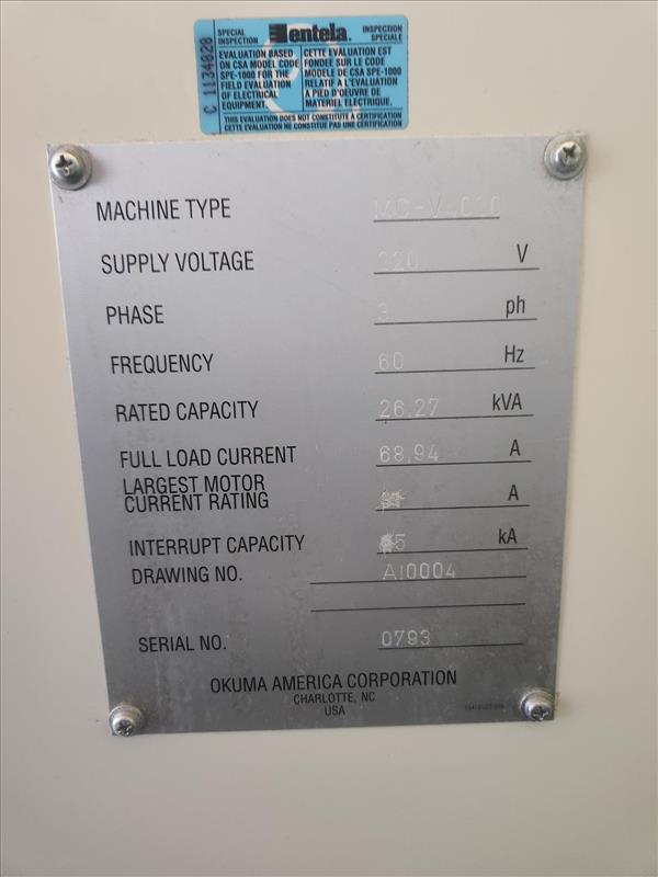 Okuma CNC vertical machining center, mod. MC-V4020, s/n 0703, 32X tool changer, 28 in. x 48 in. work table [Loc. Shop]