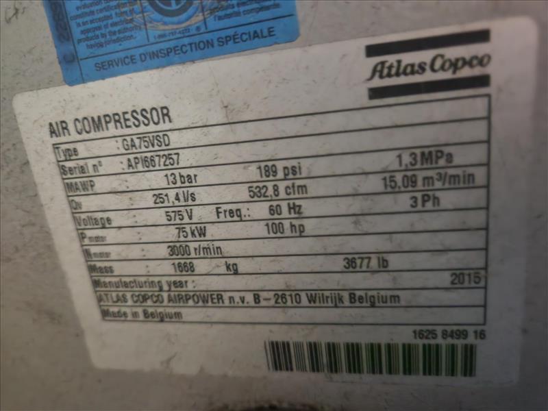 Atlas Copco air compressor, mod. GA75VSD [Loc. Comp. Rm.]