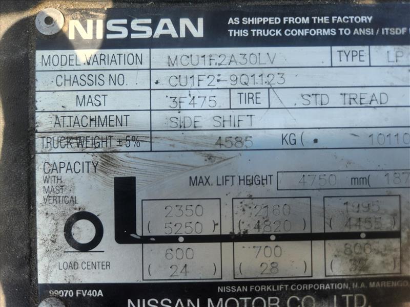 Nissan 60 lift truck, mod. MCU1F2A30LV, s/n CU1FZ-9Q1123, LPG, 5000 lbs. cap., 3-stg mast, 187 in. lift cap., side-shift, cushion tires [Loc. Plant]