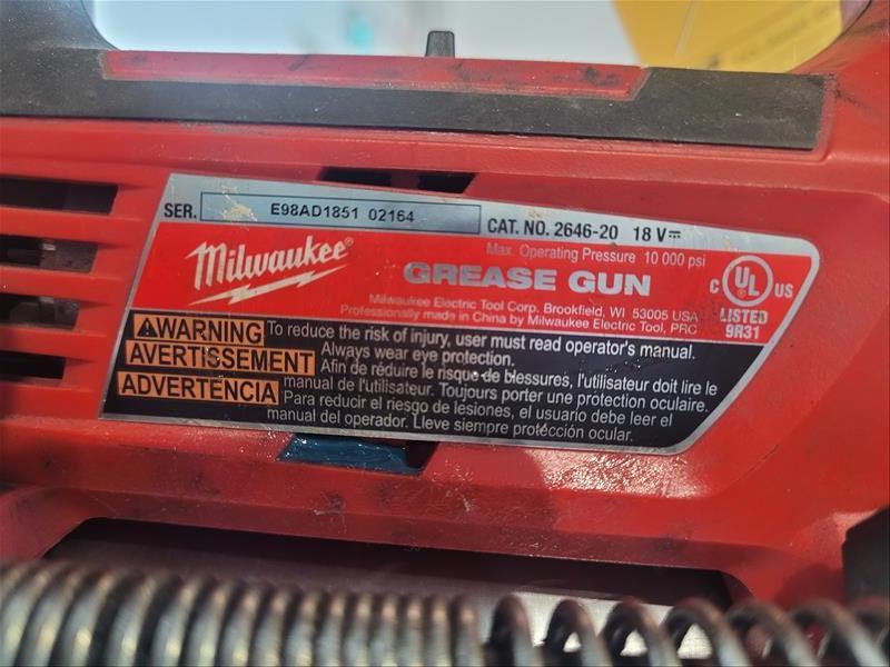 Lot (2) Milwaukee Tools Consisting of: (1) Milwaukee model no. 2802-20 Hammer Drill 18 v, and (1) Milwaukee model no. 2646-20 Grease Gun 18 v, serial no. E98AD185102164