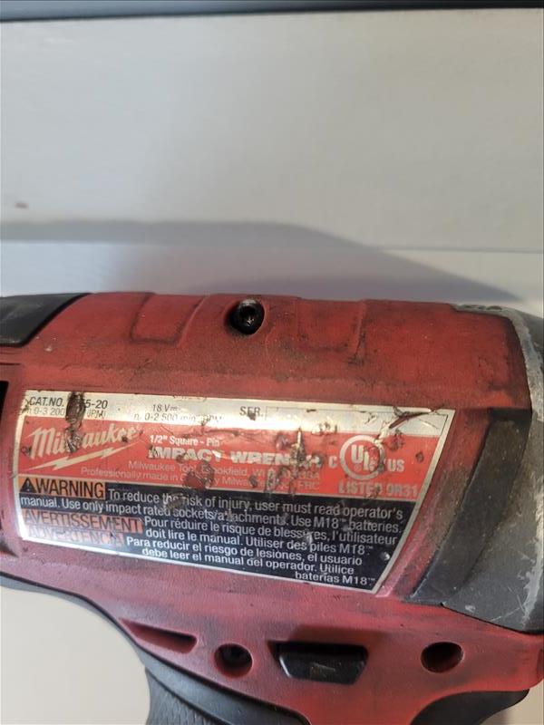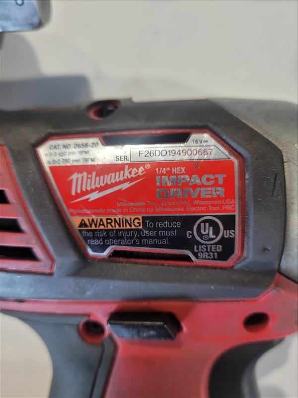 Lot (2) Milwaukee Tools Consisting of: (1) Milwaukee model no. 2656-20 1/4in. Hex-Pin Impact Driver 18 v, serial no. F26DD194900667, and (1) Milwaukee 1/2 in. Square-Pin Impact Wrench 18 v
