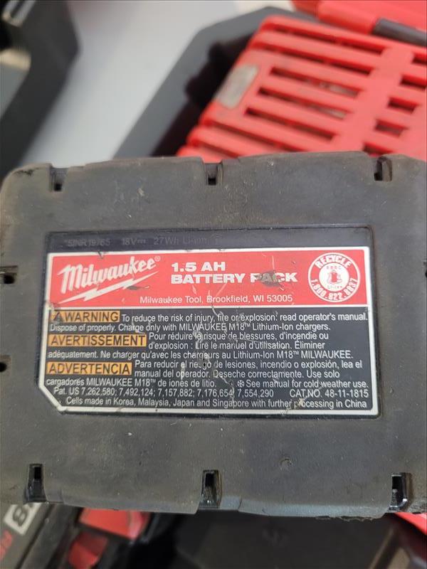 Milwaukee Toolkit Consisting of: (1) Milwaukee model no. 2606-20 1/2 in. Drill/Driver, (1) Milwaukee model no. 48-59-1812 Battery Charger 120 v Input, 12-18 v Output, (1) Milwaukee model no. 2656-20 1/4 in. Hex Impact Driver, and (1) Milwaukee Battery Pack 18 v
