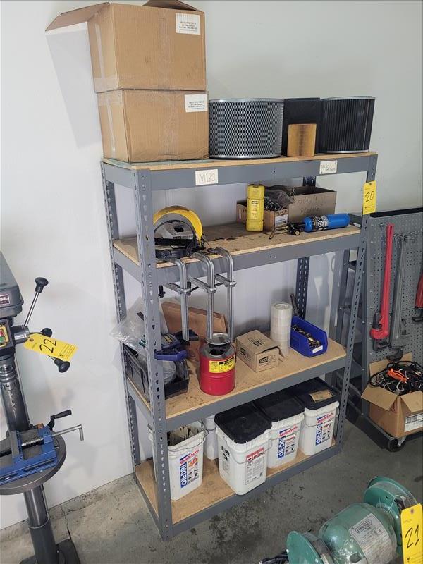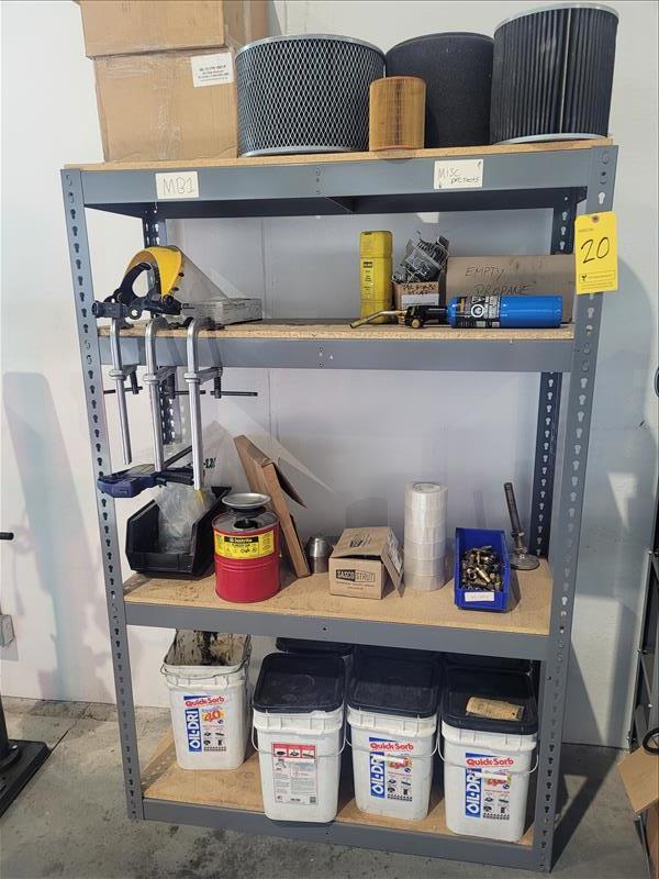Light Duty Shelving Unit w/ Contents Consisting of: Filters, Bar Clamps, Safety Shields, Torch, Quick Absorbent Oil Dry, and Tape