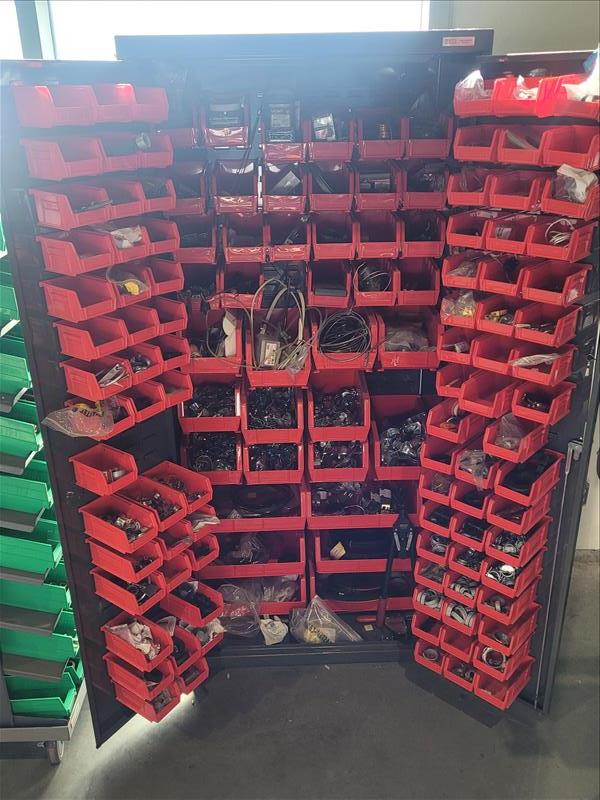 Uline 2-Door Storage Cabinet w/ Contents Consisting of: Assorted Clamps, Relays, Piping, and Drillbits (Please Inspect)