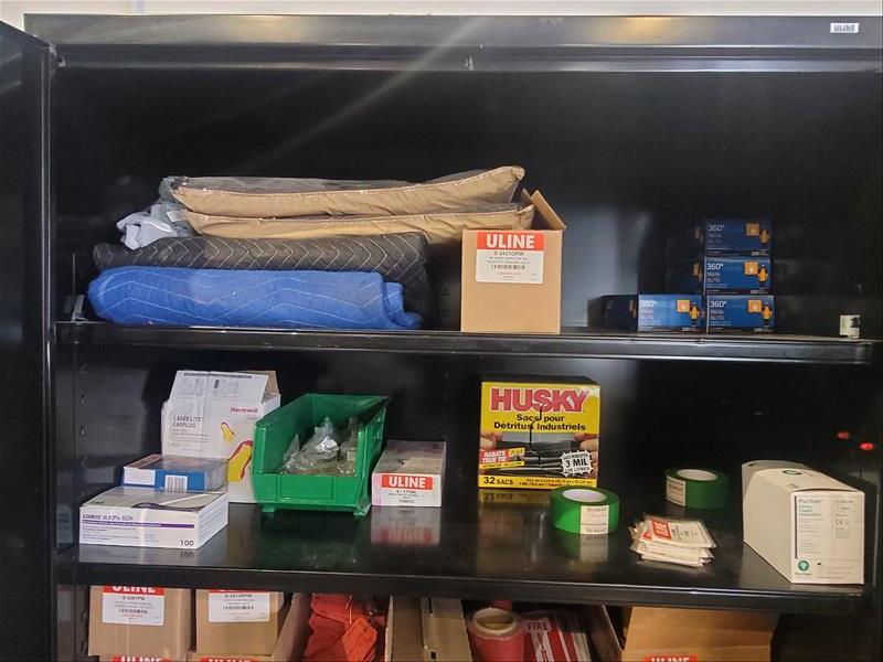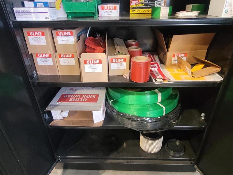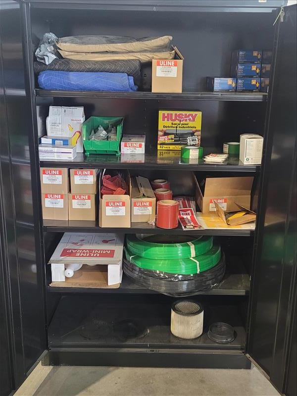 Uline 2-Door Storage Cabinet w/ Contents Consisting of: Shipping Labels, Fire Extinguisher Labels, Trash Bags, Hearing Protection, Shipping Blankets, and Banding Straps