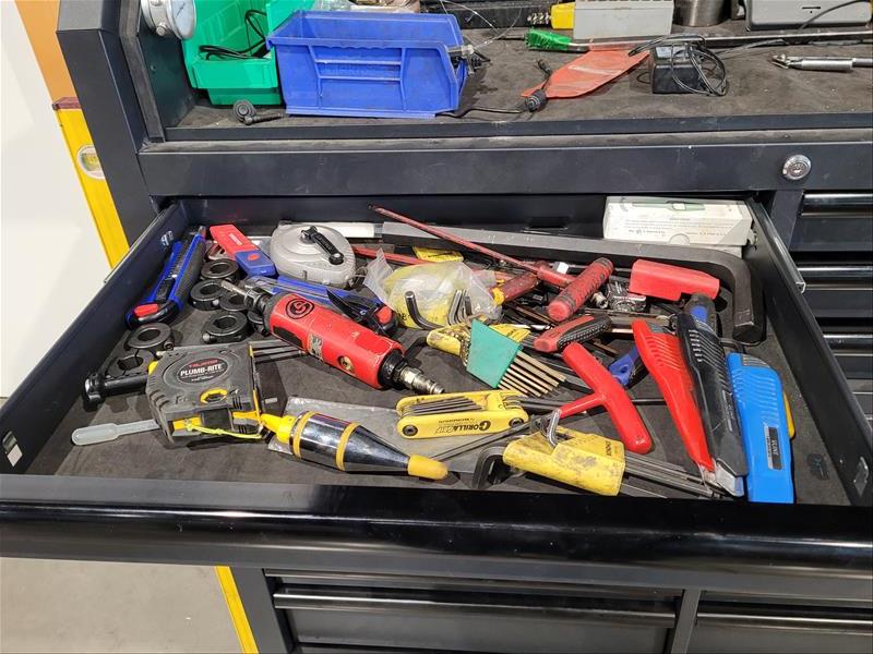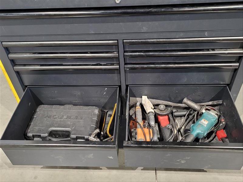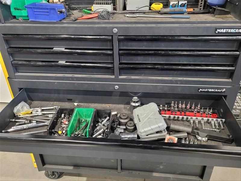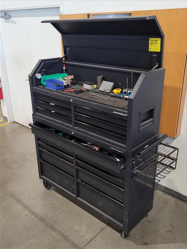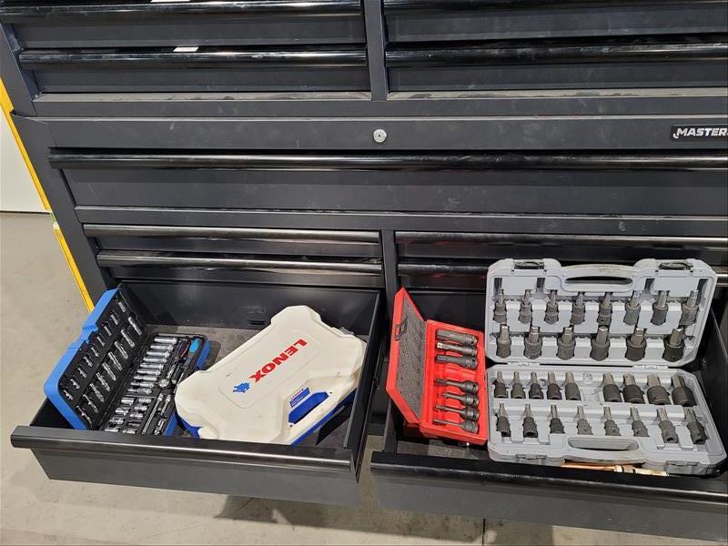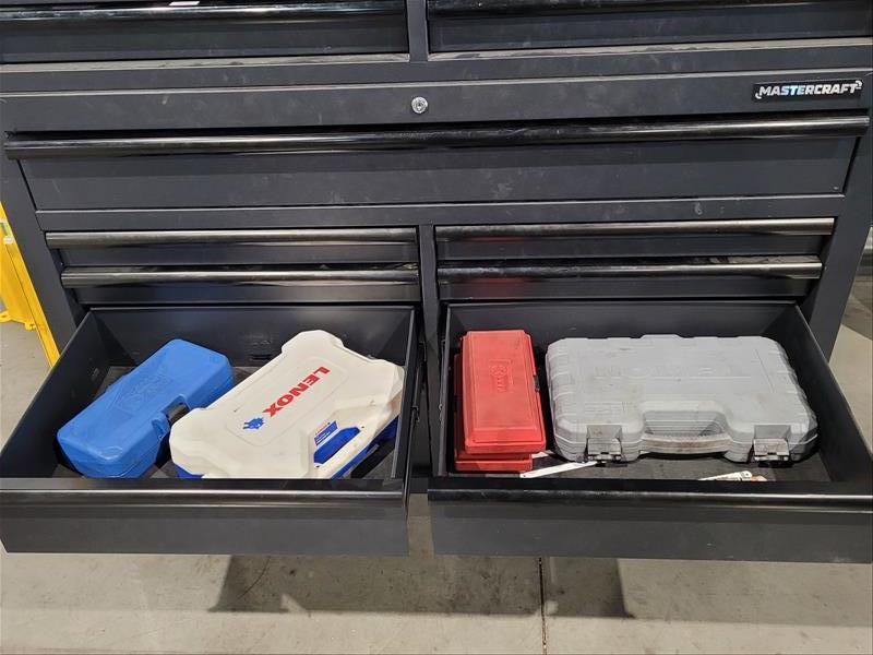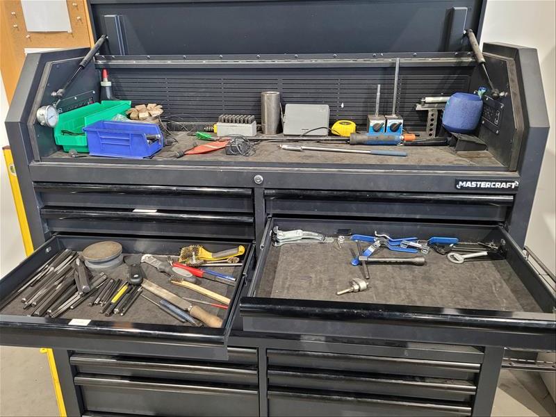 Mastercraft 15 Drawer Rolling Toolbox w/ Contents Consisting of: Grinders, Hole Saws, Socket Sets, Extentions, Punches, Stamps, Die Grinder, and Allen Wrenches (Please Inspect)