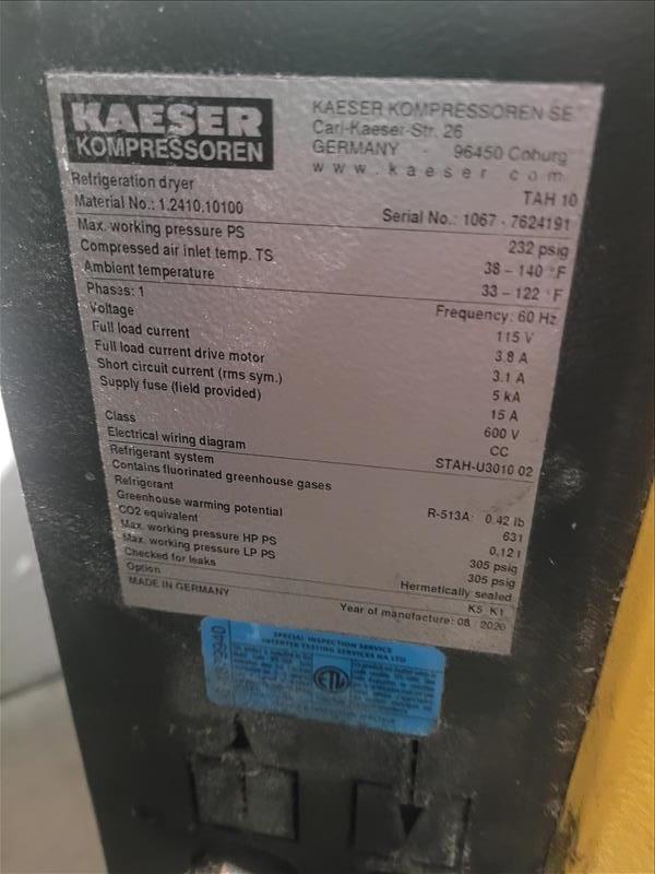 Kaeser model no. TAH10 Refrigerant Dryer 115 v, 3.8 AMPS, 232 PSIG, Refrigerant Type: R-513A, serial no. 1067-7624191