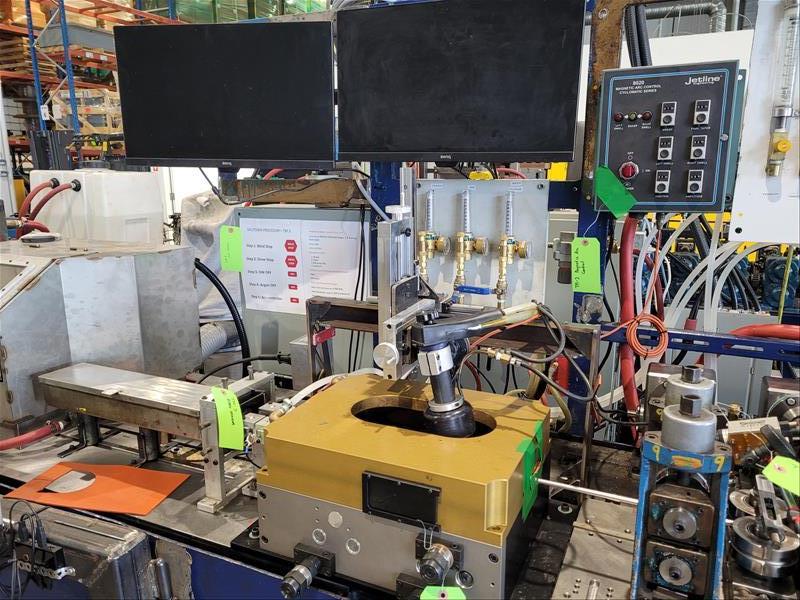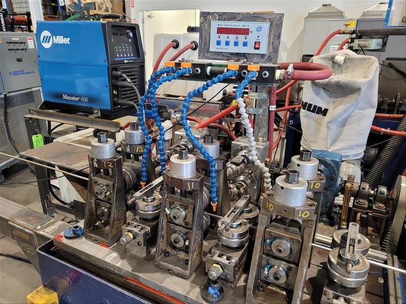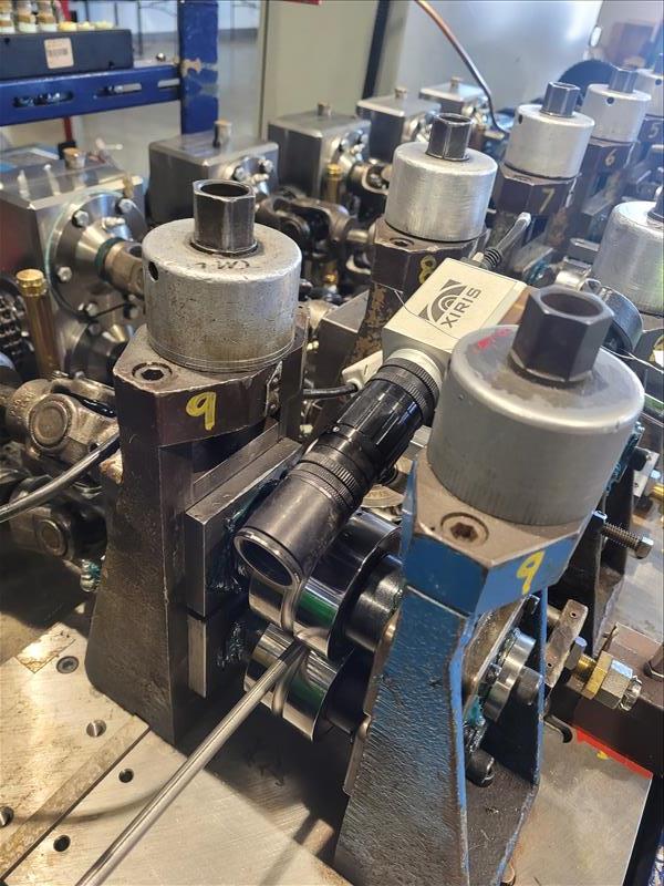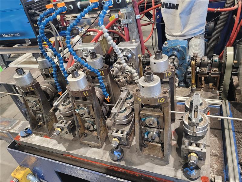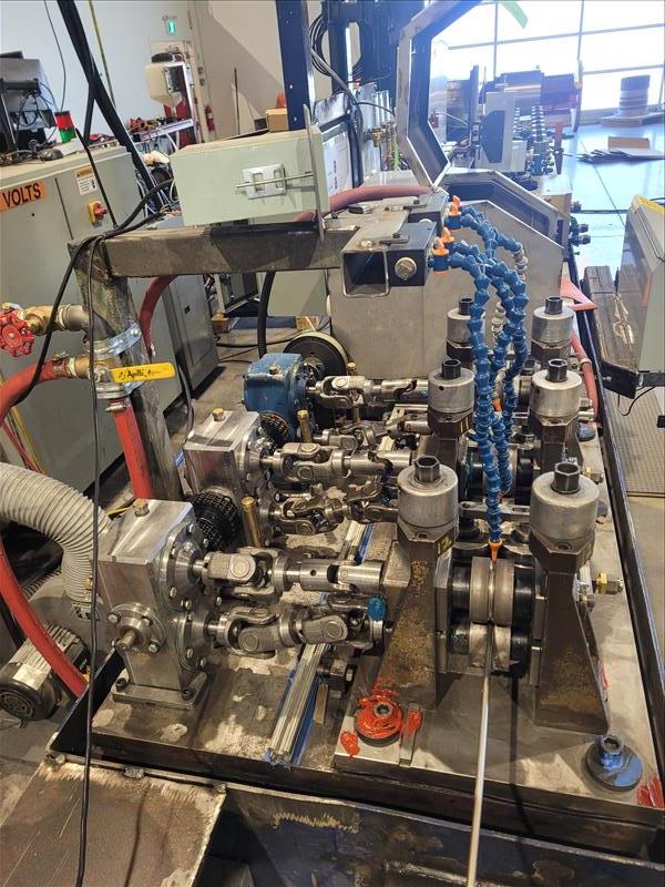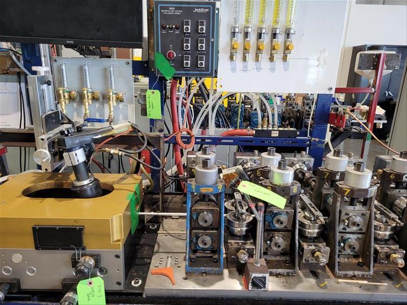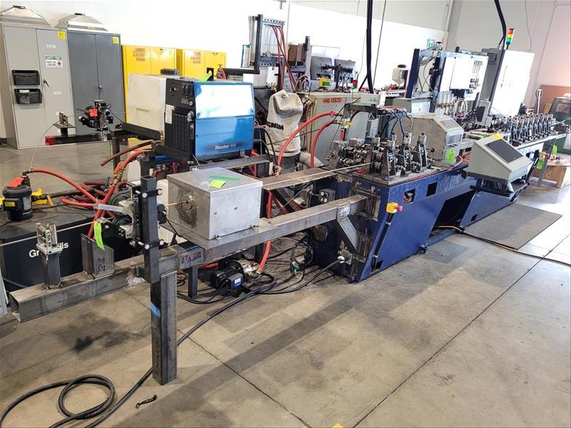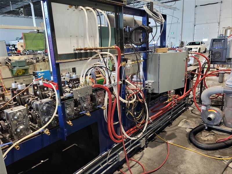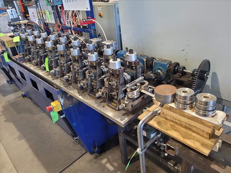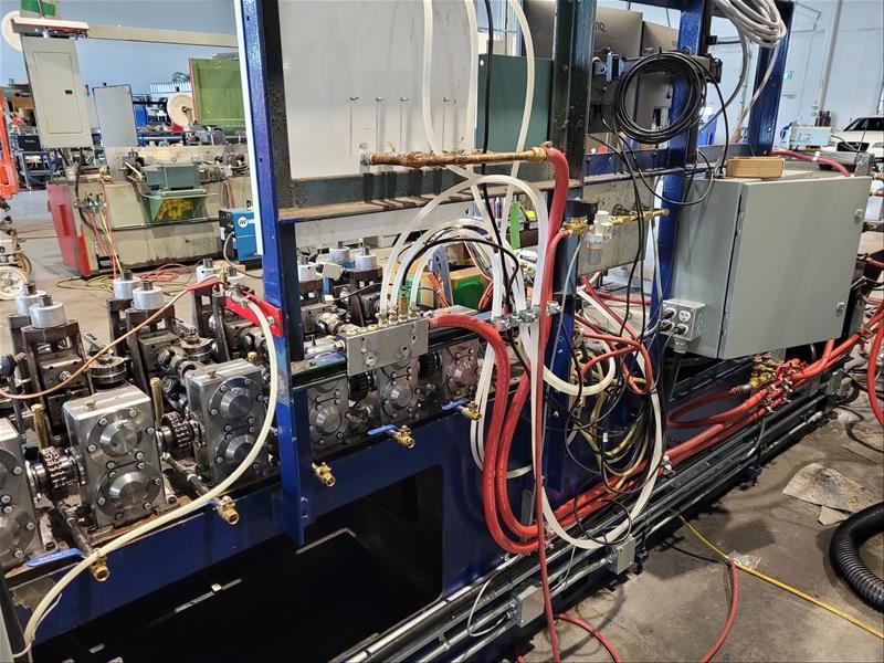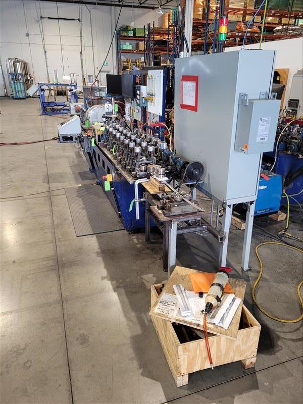(Upgraded 2022) Turek & Heller Rafted WU-11 Capillary Tube Mill - Consisting of: COE model no. CPR-PO-4036 Reel Uncoiler, Coil Weight Capacity: 4000 lbs, Coil Width Capacity: 36 inches, Recommended Operating Pressure: 10 PSI, serial no. 7325-1, (1) T& H WU-11 Rafted Tube Mill, Universally Connected, Roller Strip Guide, 9 Stand Forming w/ Side Stands, 1/4 in. Tooling, (1) Weld Box, (1) Seam Conditioner Box, 3 Stand Sizing W/ Side Stands (1) Wash Tank, (1) Jetline Engineering model no. MAG-8020 Magnetic Arc Control Cyclomatic, serial no. U5130501562, (1) Miller model no. Maxstar400 TIG Welder 400 AMPS, serial no. ND040959L, (1) Xiris model no. 823-500-02 Camera, (1) Magnetic Analysis Corp model no. MiniMAC 50 Eddy Current Inspection, serial no. 050MACS-13871, (1) Length Counter Encoder, serial no. 677623090603, (1) Xiris model no. 823-500-02 Camera, (1) Roswell Torque Controlled Oscillate Winder, (1) Dynamic model no. FD-7543-4001 Torque Motor 230/460 v, 1745 RPM, (1) Nord Drive Systems model no. SK573.1N56C109.21:1 Gearbox, serial no. 202365870-100, and (1) PCW Circulating System, Coil Winder w/ 3 Motors Consisting of: (1) Ironhouse model no. MTPM-001-1M18 1 HP Motor 1800 RPM, (1) SEW Eurodrive model no. R57AM56 Motor 1750 RPM, and (1) Dynamic model no. FD-7543-4001 3/4 HP Motor 1600 RPM, Touch Screen Operators HMI [Tagged as 98, 99, 100] - also included Lot of Assorted Gears and Motors and Lot of Assorted Gears [Tagged as 129 and 131] (Please Inspect)